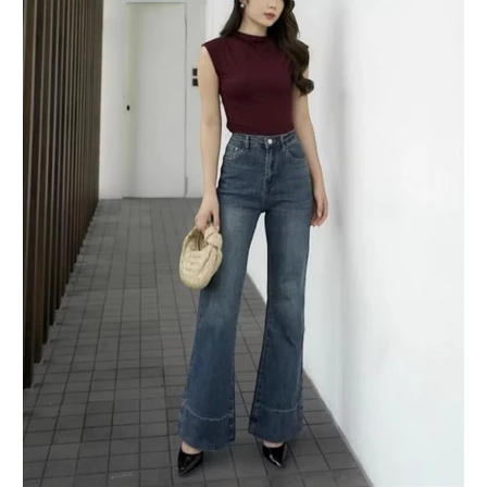 Jennie-Highwaist Cutbray Jeans Celana Flare Panjang Stretch Wanita Retro Vintage Lipat Bawah