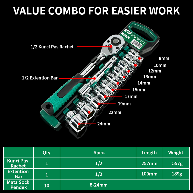 Kunci Isku Mata Kunci Sok Set 10Pcs Termasuk Mata Sock 824Mm 12 Inch 6Pt Gagang Sock Tool Kit