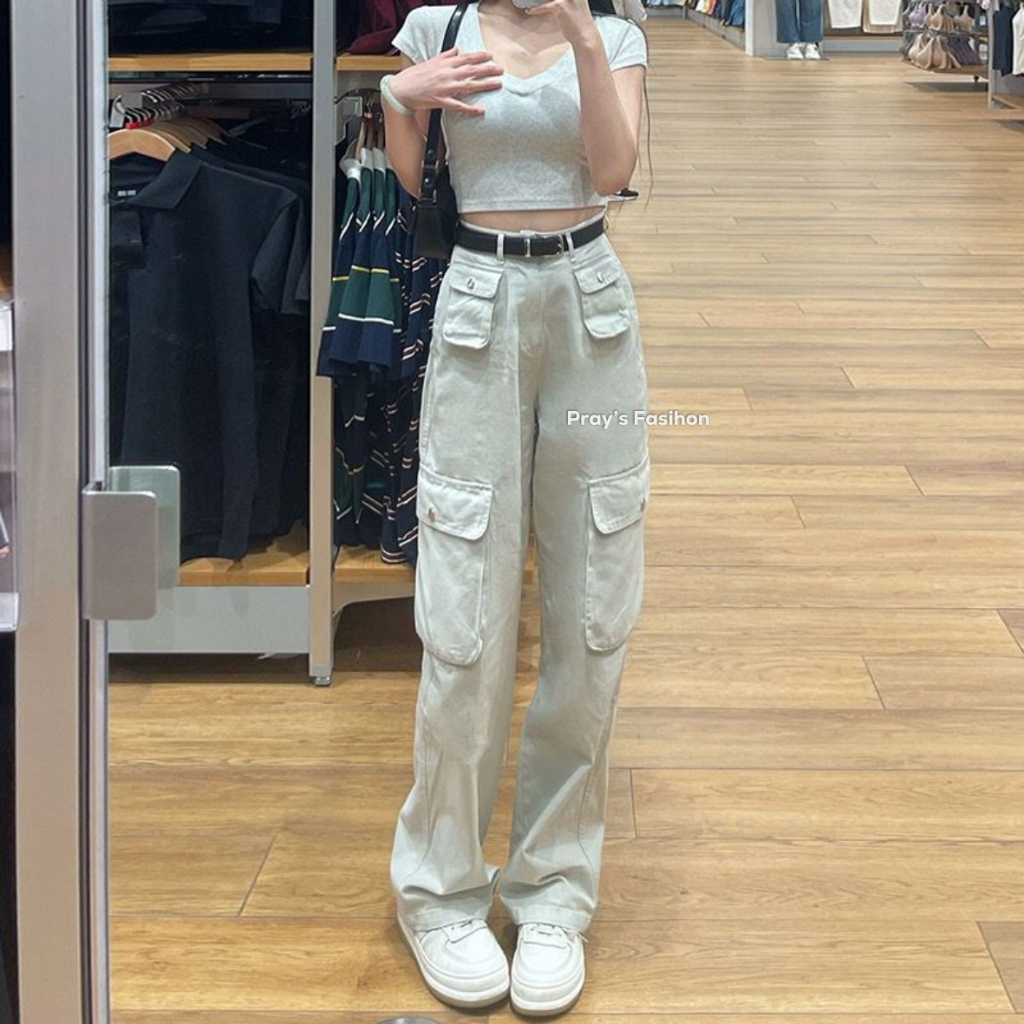 Cargo Denim Pasir Putih Prays Fashion Highwaist Loose Celana Jeans Wanita