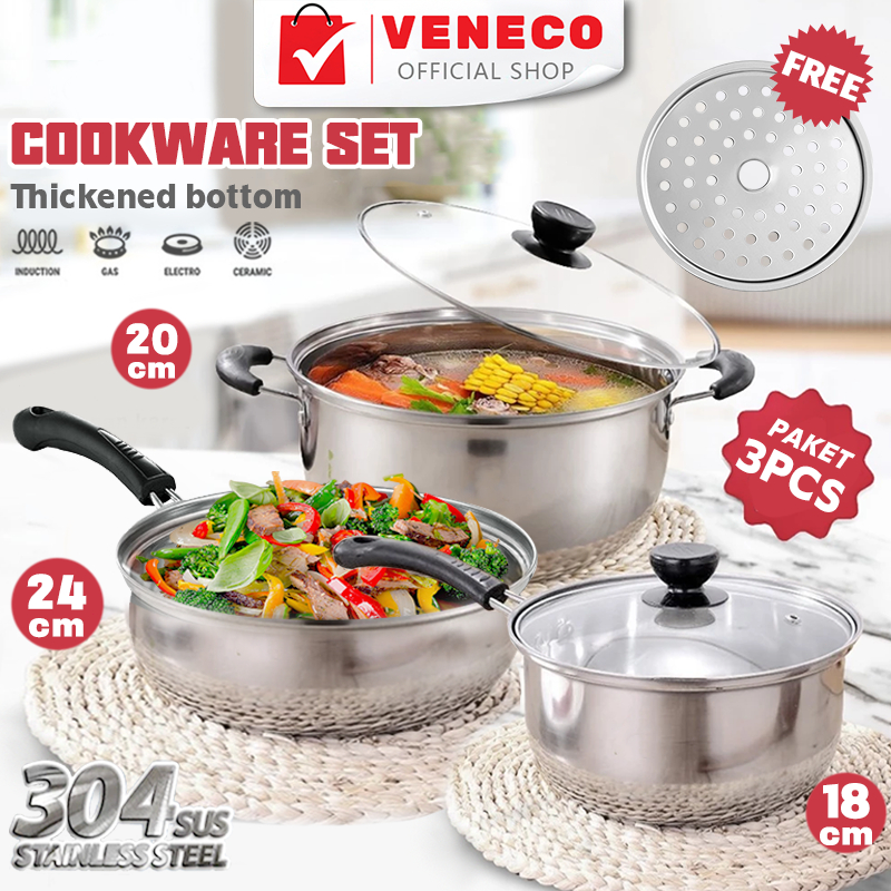 PANCI STAINLESS STEEL 3 Set Panci dan Wajan Stainless Steel / Panci Sup 20cm Panci Mie 18cm Wajan 24cm