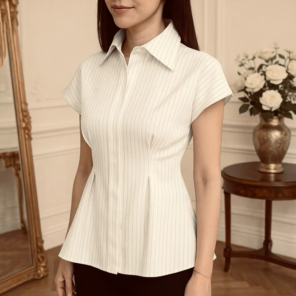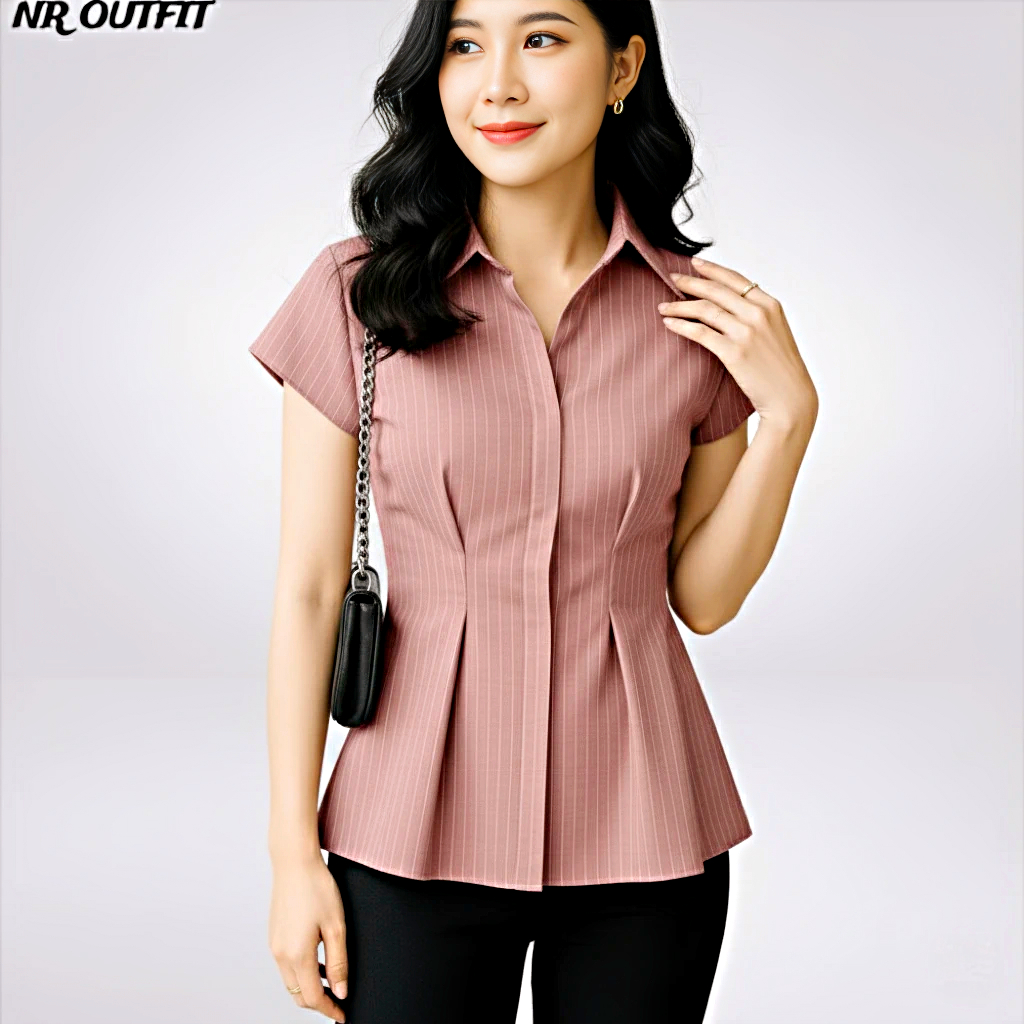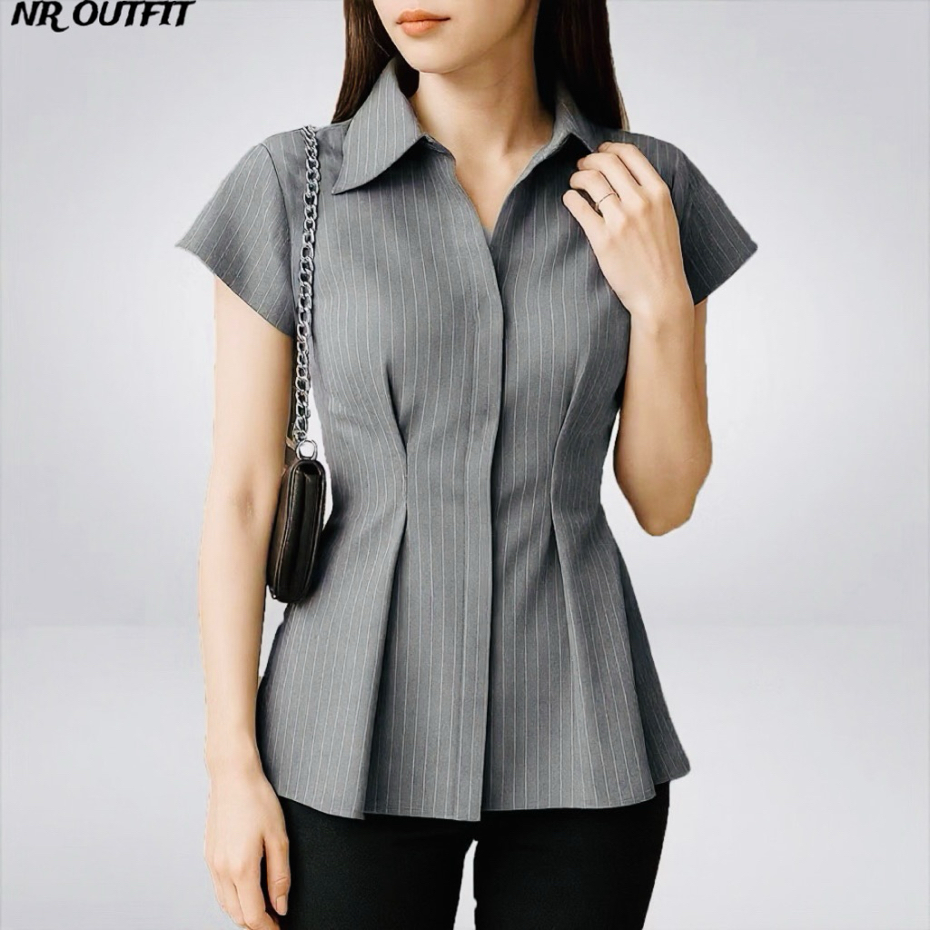 Alba Top - Atasan Wanita Lengan Pendek Slim Fit - Kemeja Wanita Fitted Stripe Salur Basic Casual Bahan Semi Woll - Kemej
