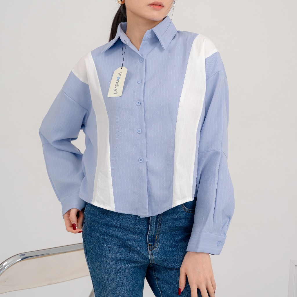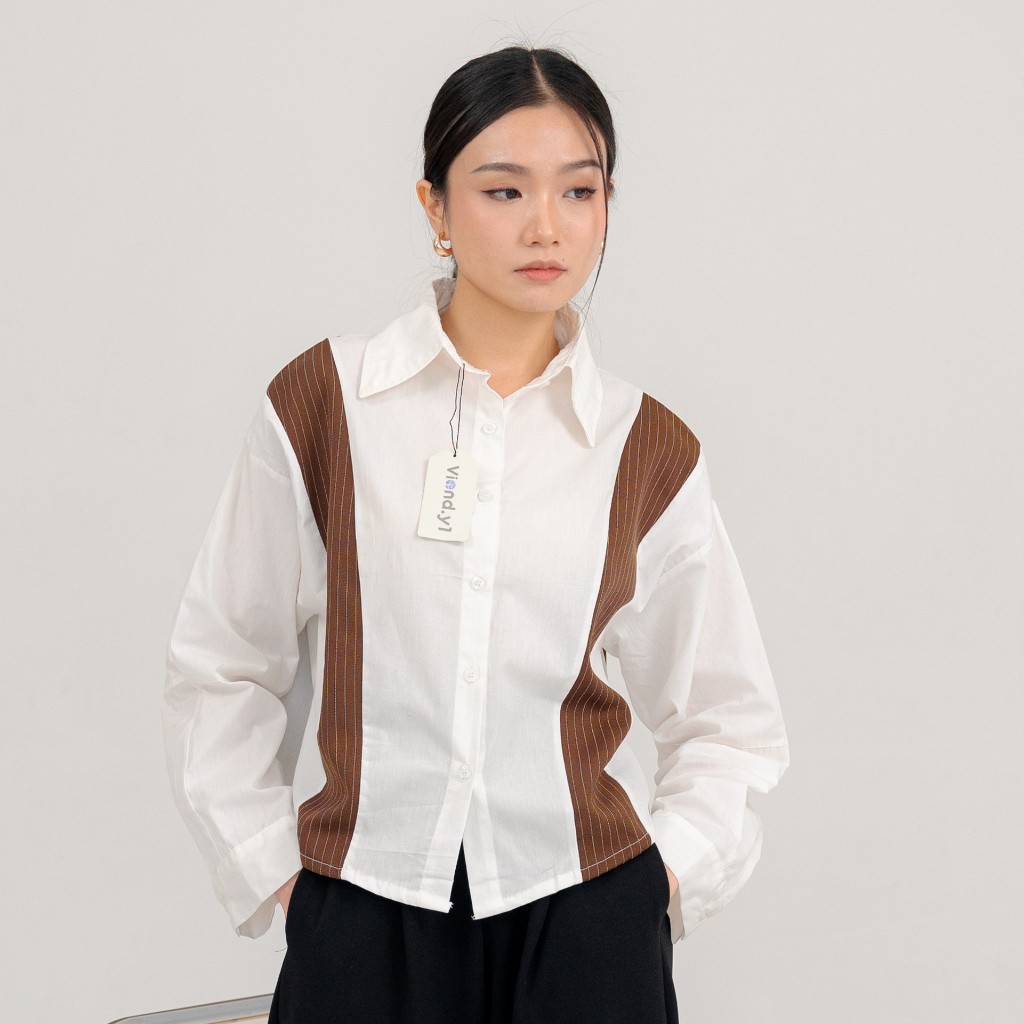 Blouse Kombinasi Katun Polos Dan Salur Wanita Terbaru / Atasan Kemeja Korean Style Long Sleeve E.208