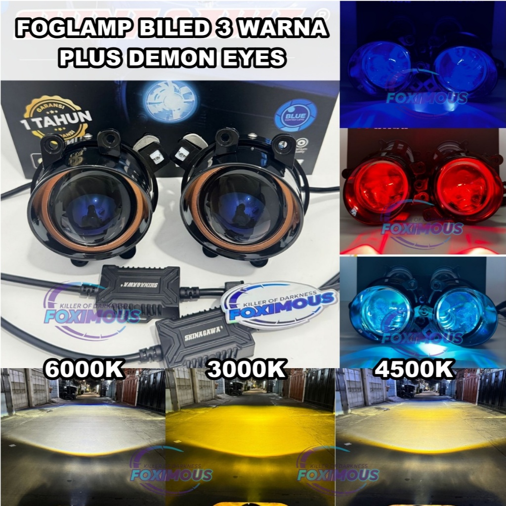 Foglamp Biled 3 inchi Bluelens 3 Warna Plus Demon eyes Shinagawa Plus Brecket Honda Toyota 3 inch