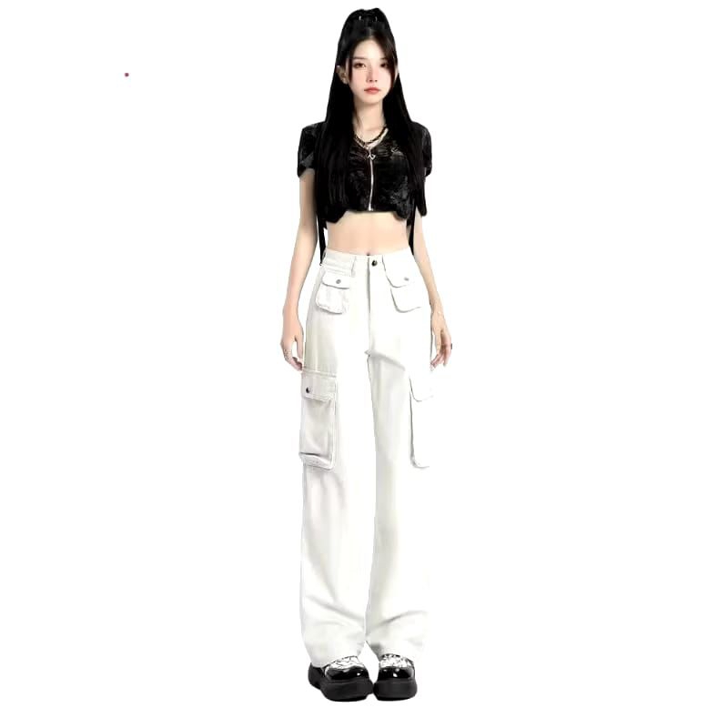 Celana Cargo Panjang Wanita Denim Highwaist Loose Korean Style
