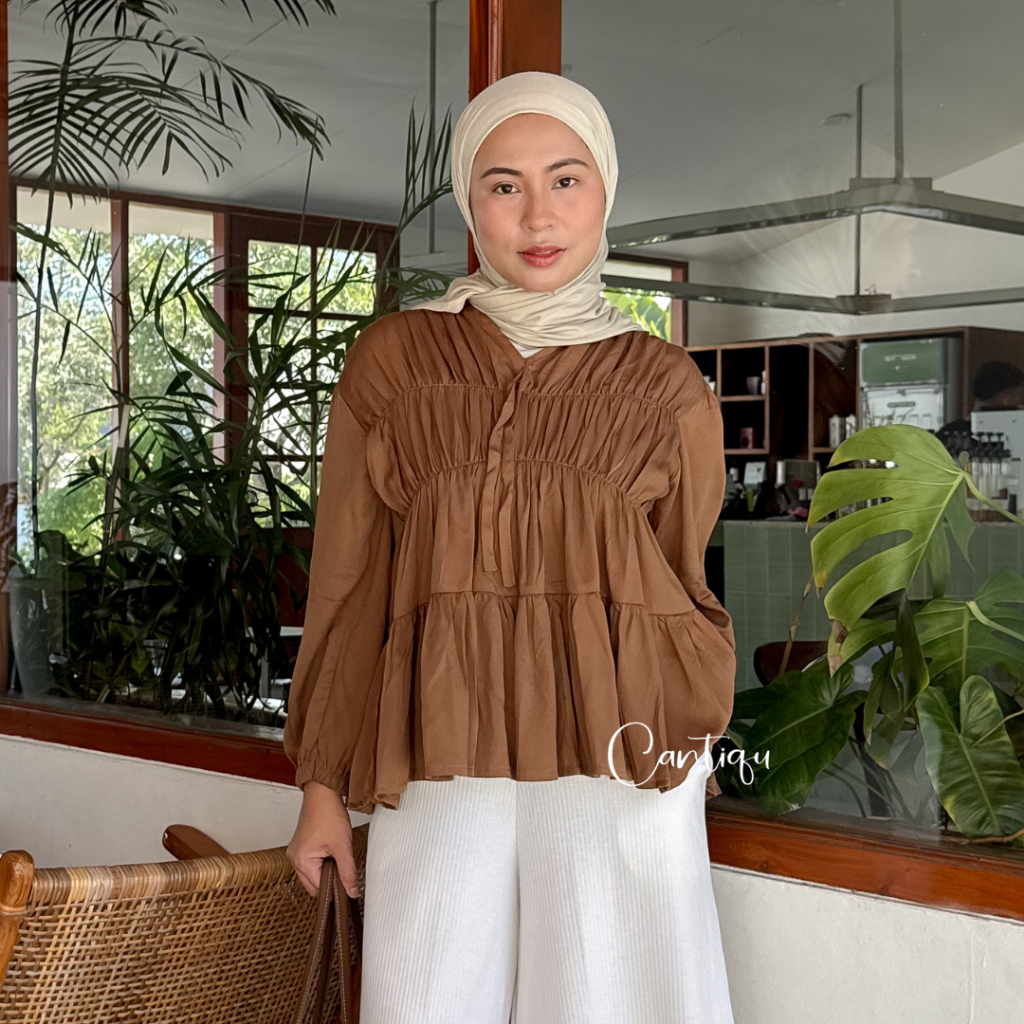 Cantiqu - Mireya Blouse Kerut Rayon Atasan Wanita Polos Warna Lengan Panjang
