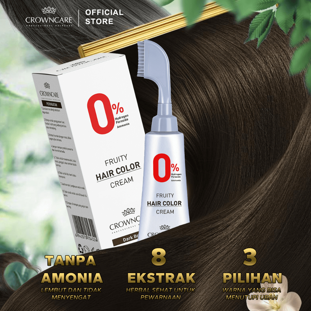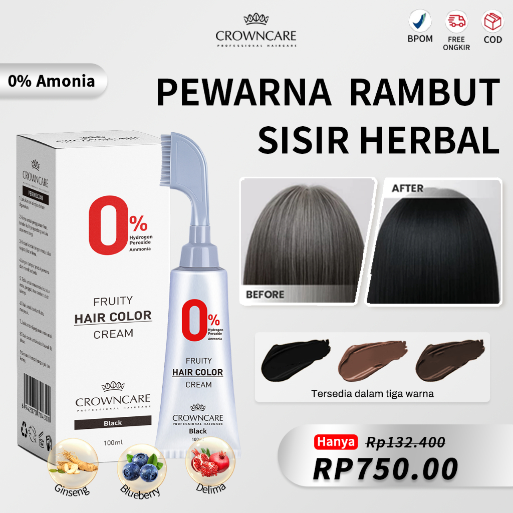 Crowncare Pewarna Rambut Herbal Alami BPOM, Hair Coloring Cream dengan Sisir, Bebas Amonia & SLS, Tutupi Uban Dengan Cep