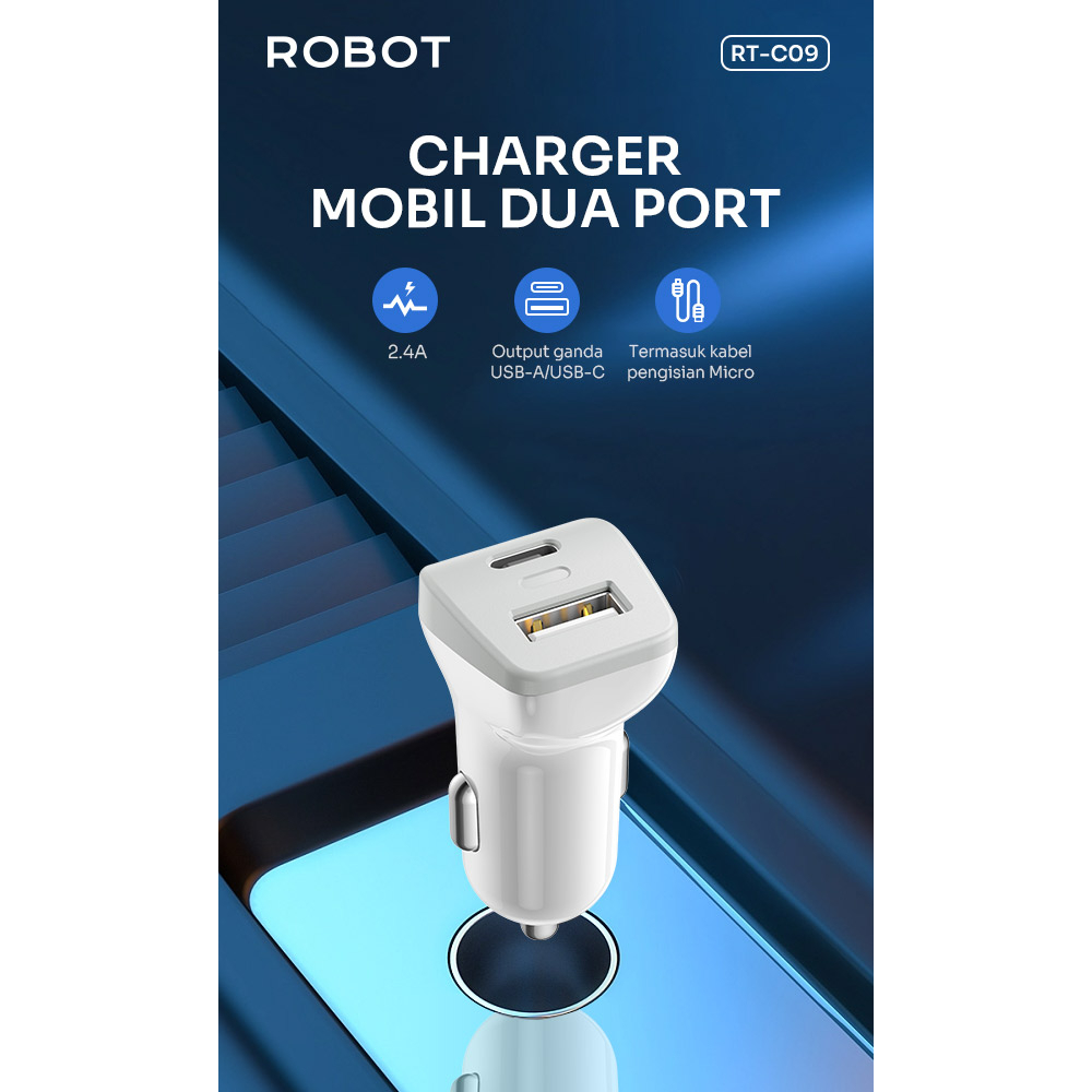 Robot Sever Mobil RT-C09 Adaptor Car Charger Mobil 2.4A Dual Port USB-A & USB-C Include Cable Micro Garansi Original Res
