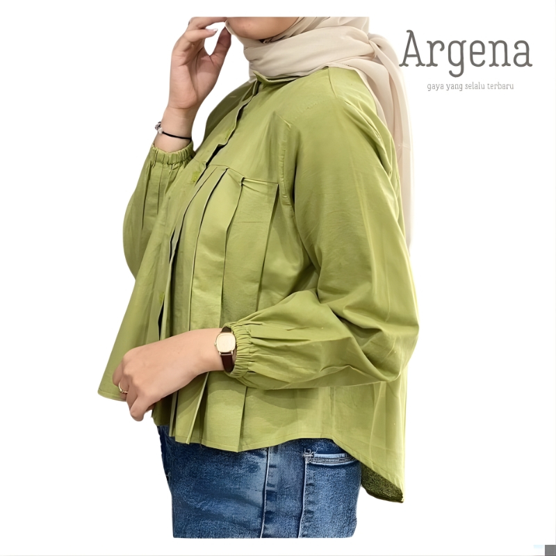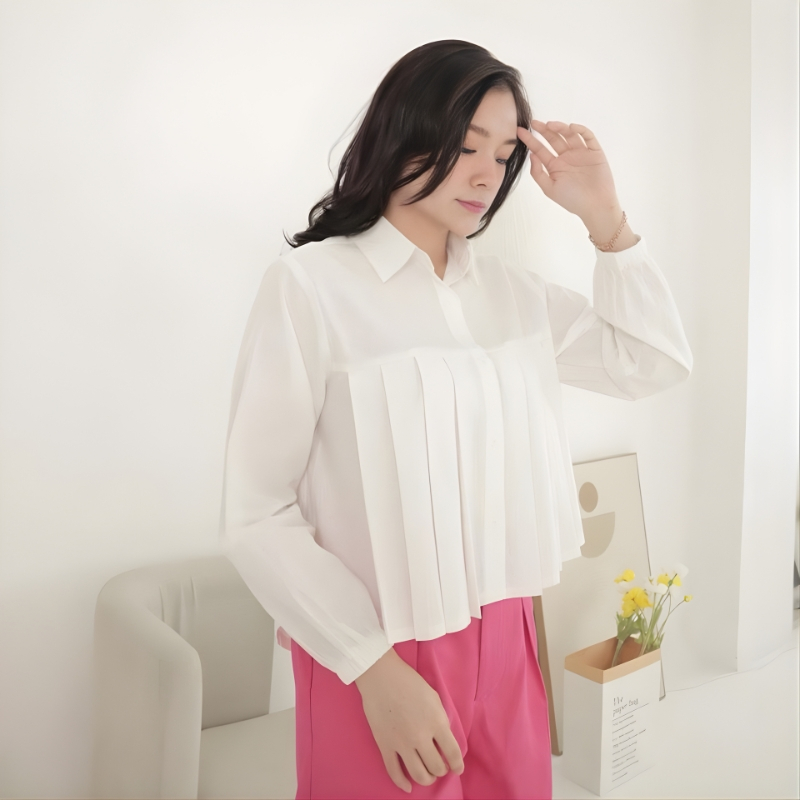 Herra Blouse Crop Linen | Atasan Kemeja Wanita Rempel Lipit Depan