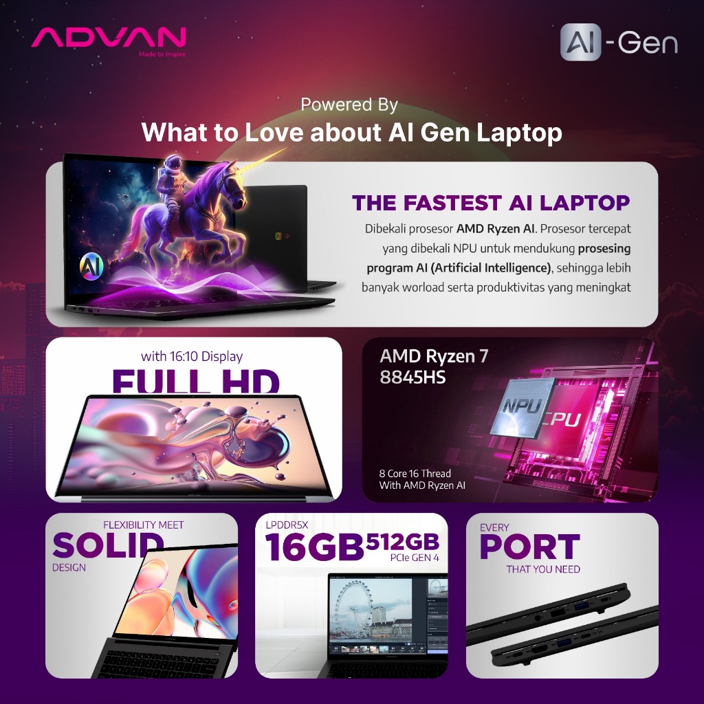 ADVAN Laptop Ai Gen Ryzen 7 8845HS AMD Ryzen AI IPS 100 PERSEN sRGB 16GB 512GB Windows 11 HD716S05A