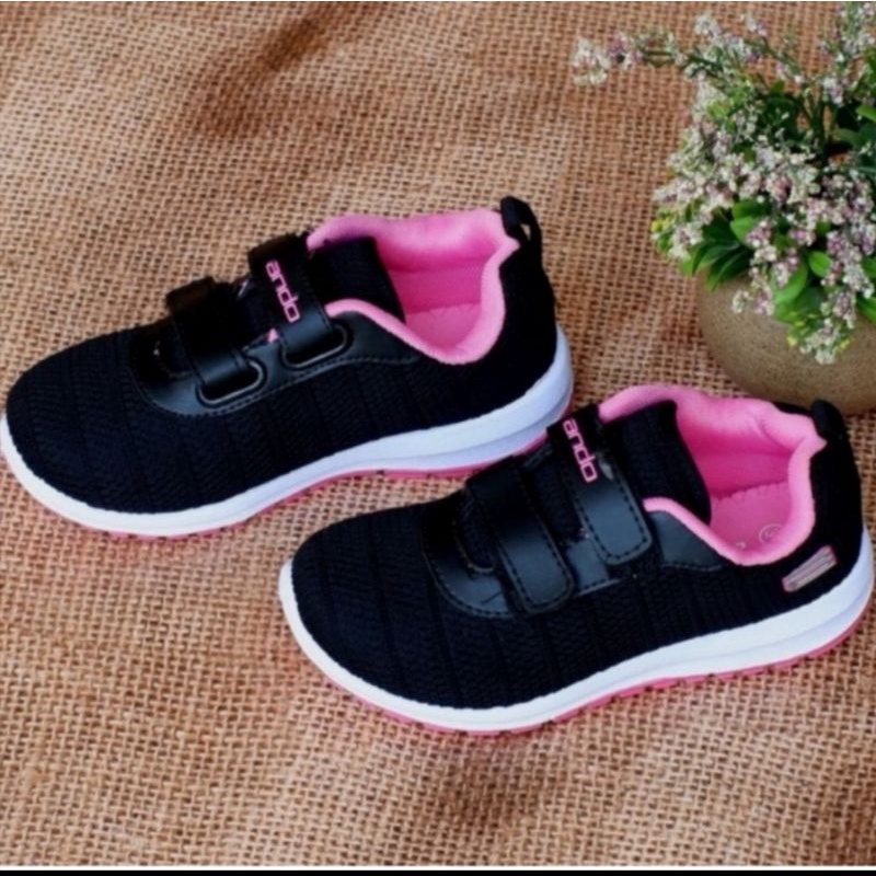 ANDO Sepatu Sekolah Anak Perempuan Cewek Kecil Hitam Pink Rebecca Original Perekat Size 29 sd 36
