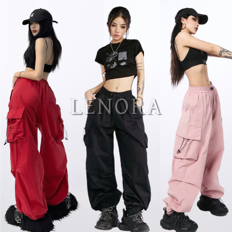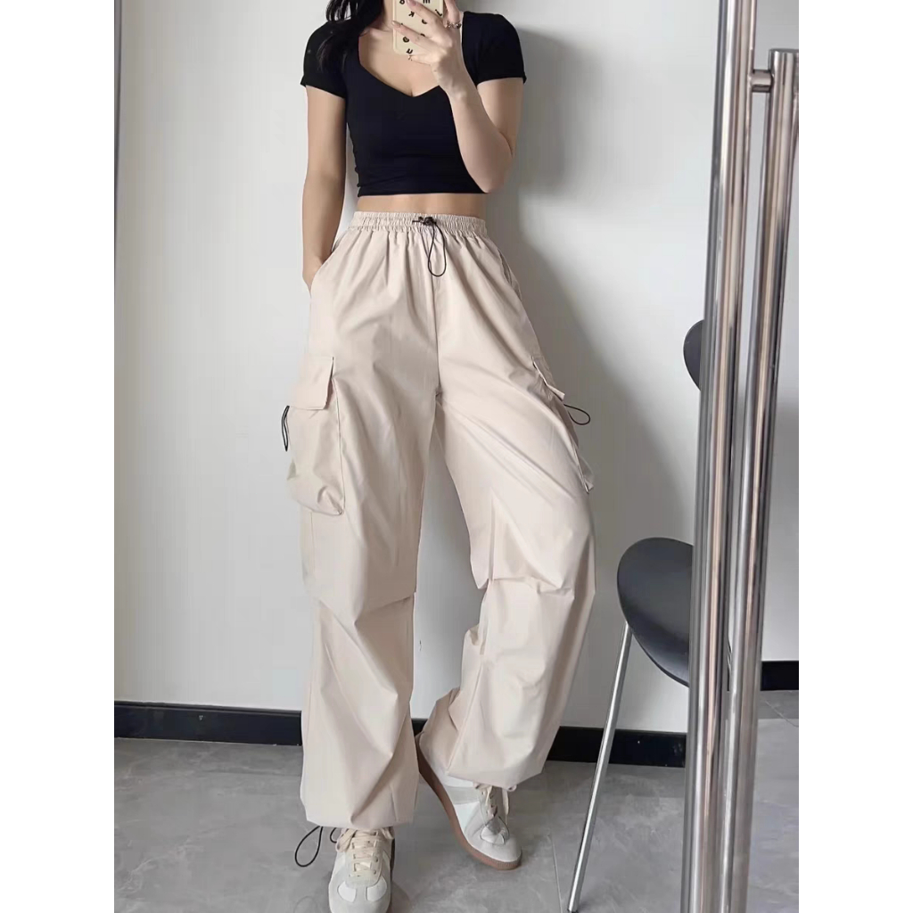 Celana Kasual Retro Celana Serbaguna Trendi Lebar Kaki Lurus Cargo Wanita Longgar