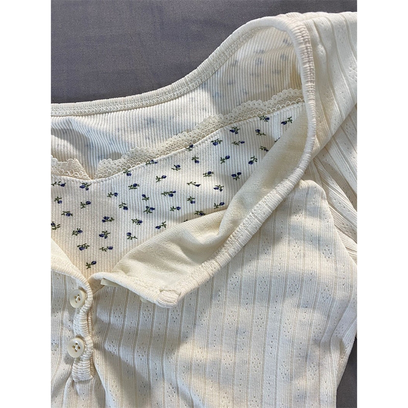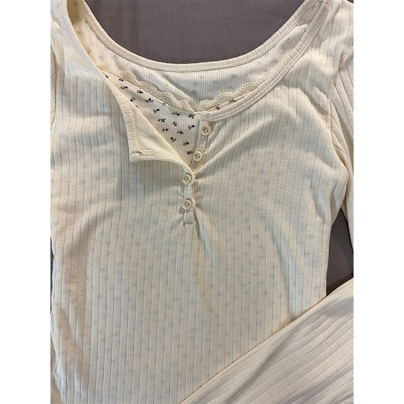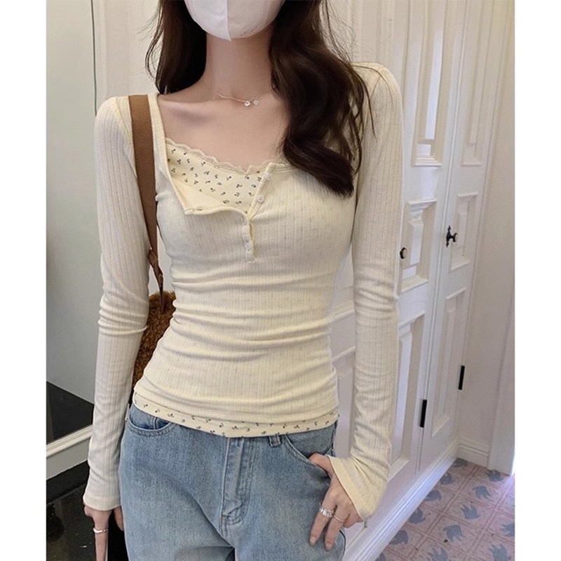 Kaus Lengan Panjang Dua Potong Palsu Sambungan Renda Atasan Slim Fit Aprikot Fashion Wanita Gaya Korea