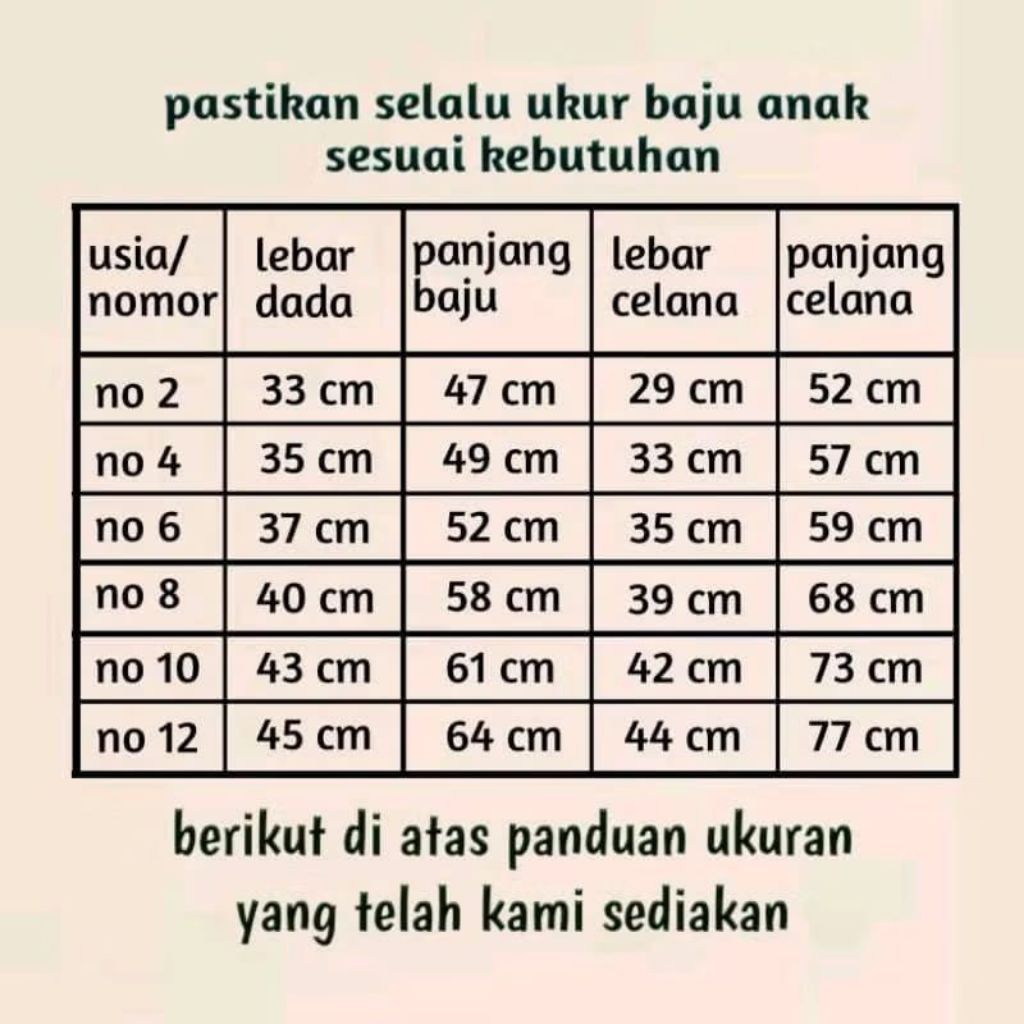 No 2 (usia 1-2thn), No 4 (usia 3-4thn), No 6 (usia 5-6thn, No 8 (usia 7-8thn), No 10 (usia 9-10thn), No 12 (usia 11-12thn