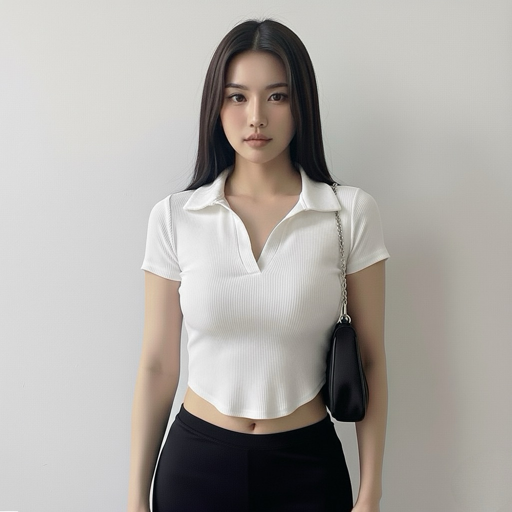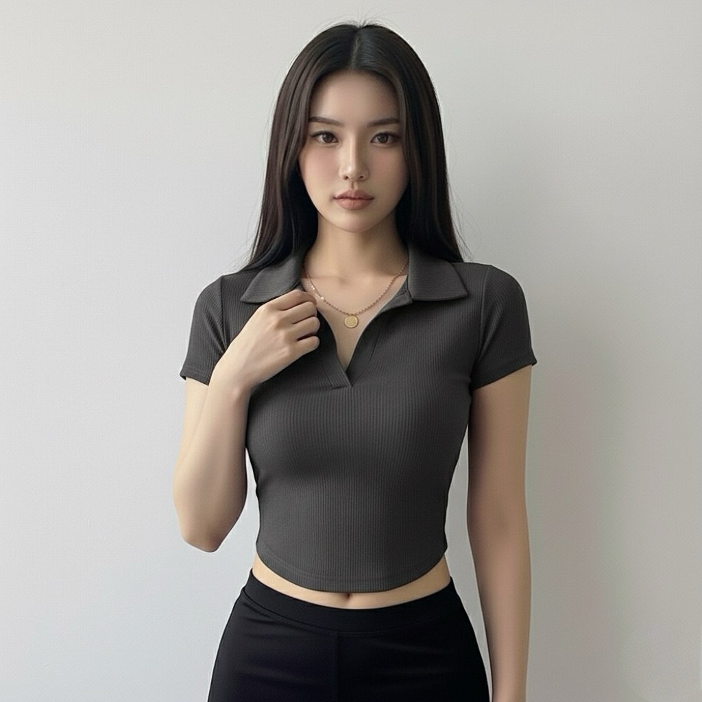 Crop Top V Neck Selver Short Sleeve Rib Premium Korean Style