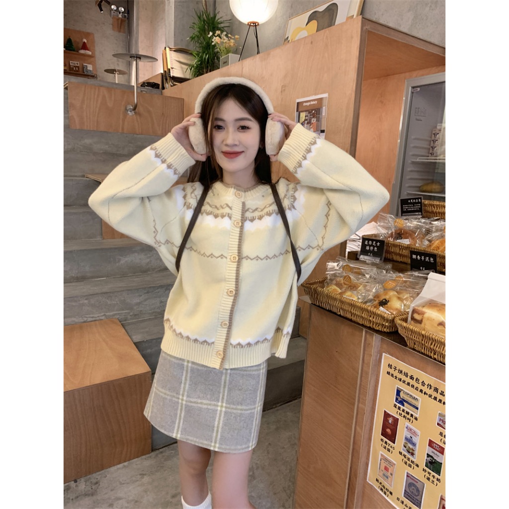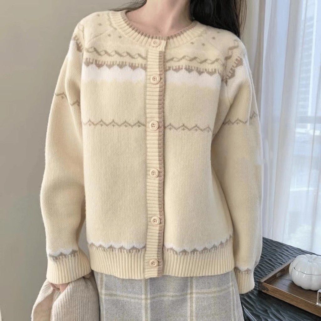 Monica Cardigan Imut Motif Zig Zag Beige Halus Knitwear Santai Wol Outer