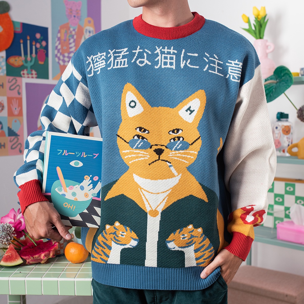 Oh.Irv - Burning Cat Knitted Sweater Unisex Retro