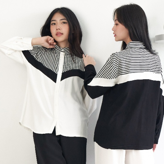 Queentin Kemeja Wanita Kombinasi 0751 Rayon Viscose Polos Mix Katun Salur Lengan Panjang