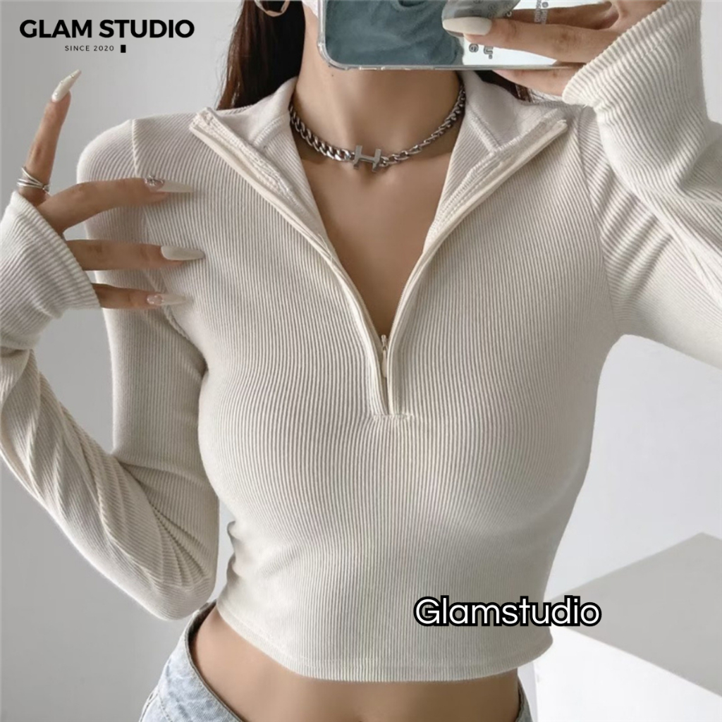 Crop Top Zipper Glamstudio Long Sleeve Kaos Crop Wanita
