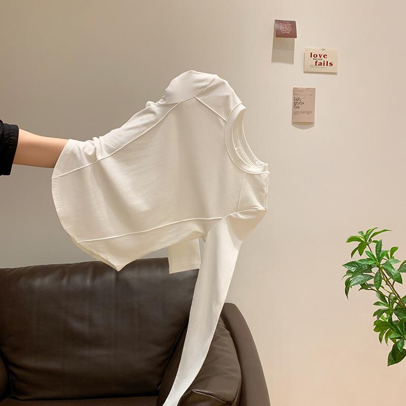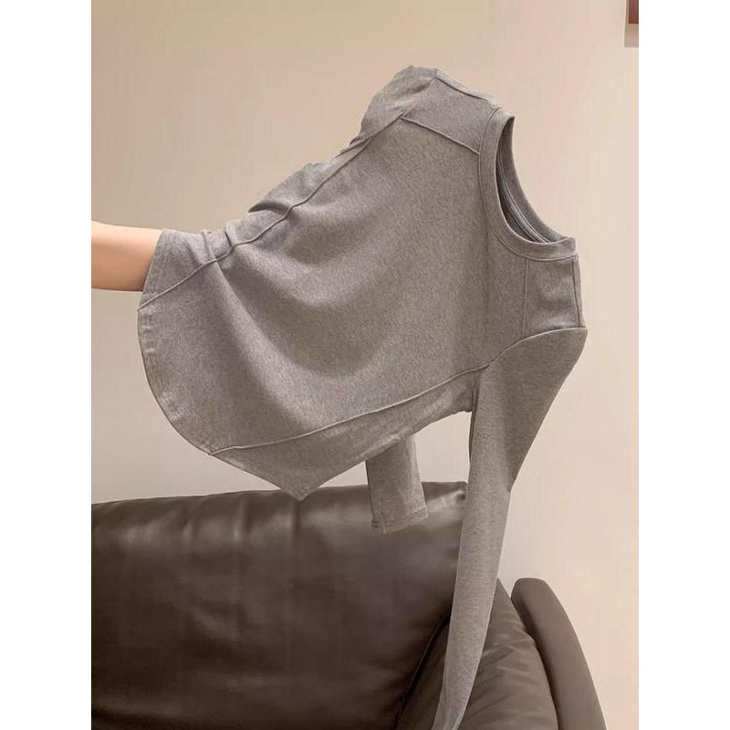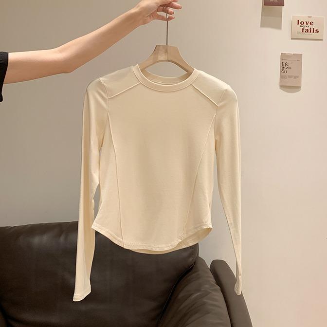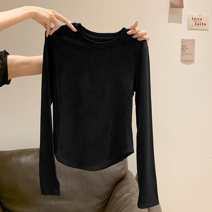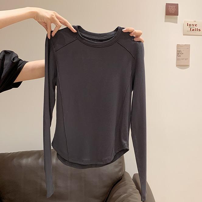 T-Shirt Lengan Panjang Crew Neck Pola Tulang Ikan Abu-Abu Kaos Ootd Polos Wanita Kekinian