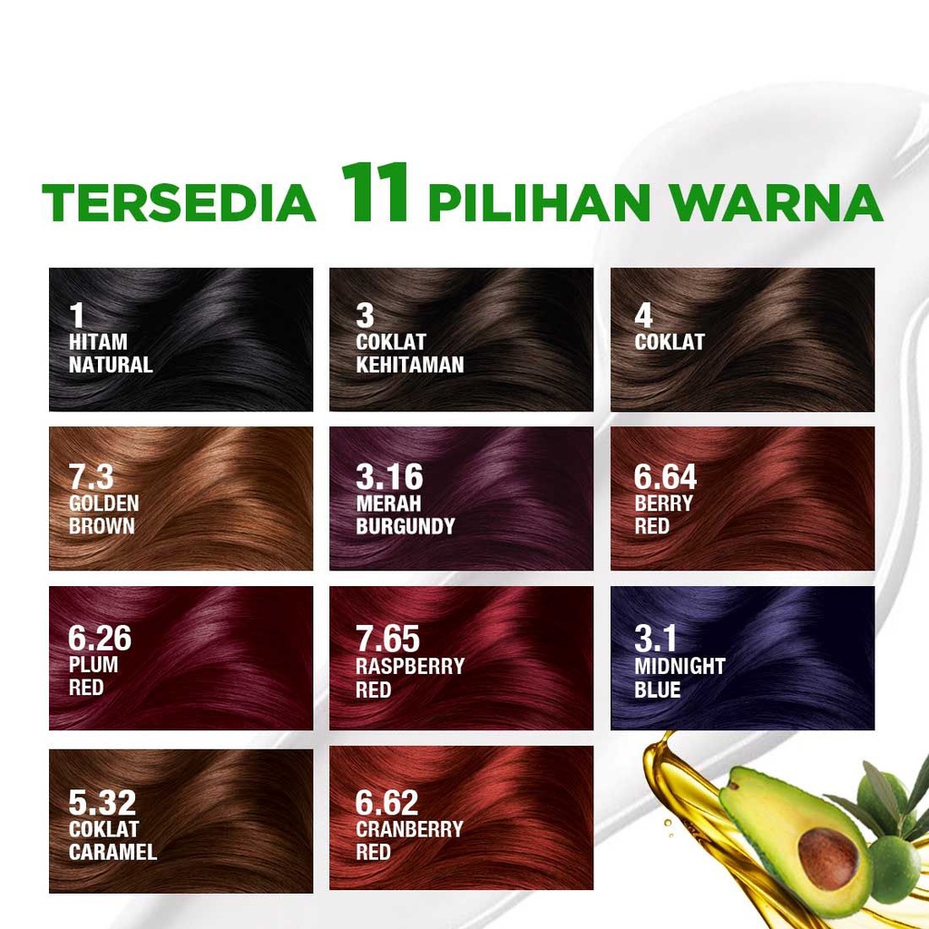 1 Hitam Alami, 3 Coklat Kehitaman, 3.16 Burgundy Alami, 4 Brown, 5.32 Coklat Caramel, 6.64 Merah Berry, Ultra 3.1 Midnight B, Ultra 6.26 Plum Red, Ultra 6.62 Cran. Red, Ultra 7.3 G. Brown