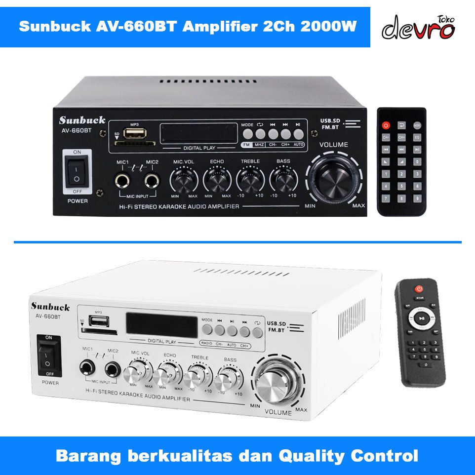 Sunbuck AV-660BT Amplifier Bluetooth 5.0 DAC Stereo 2 Channel dg Remote - 2000W - 2 Channel - 2 Input Mic - Radio - USB - SDCard - RCA Input