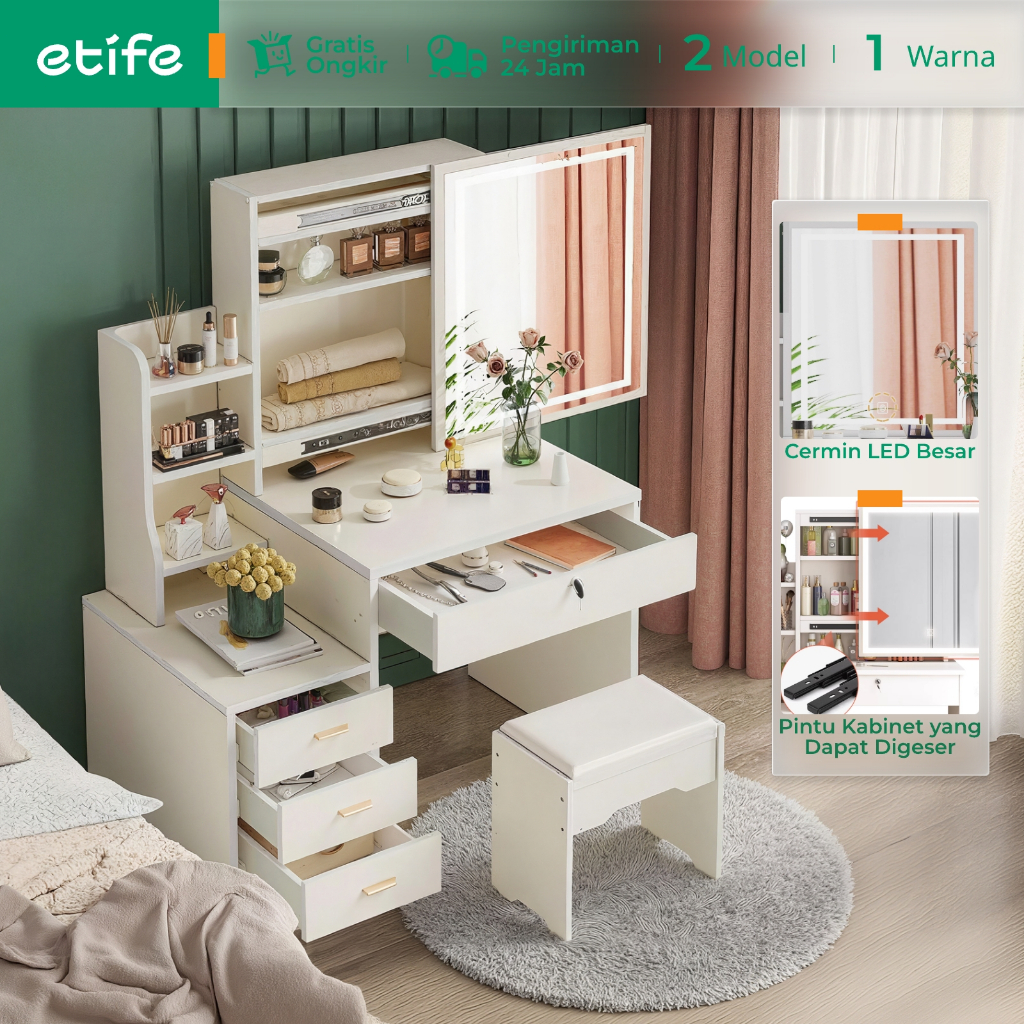 Meja Rias Lampu Led Merek E-Tife Putih Kaca Sliding Aesthetic