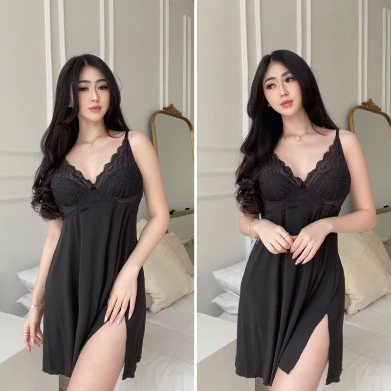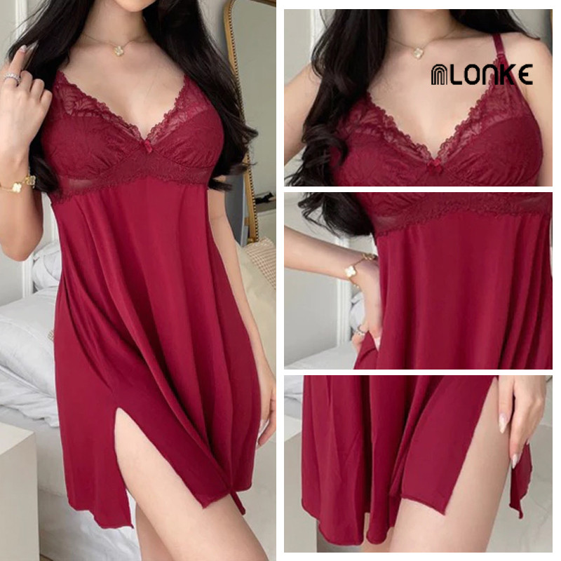 NLONKE - Gaun Tidur Renda Belahan Samping Gaun Tidur Suspender Tipis Gaun Tidur Seksi Set Pakaian Dalam Wanita
