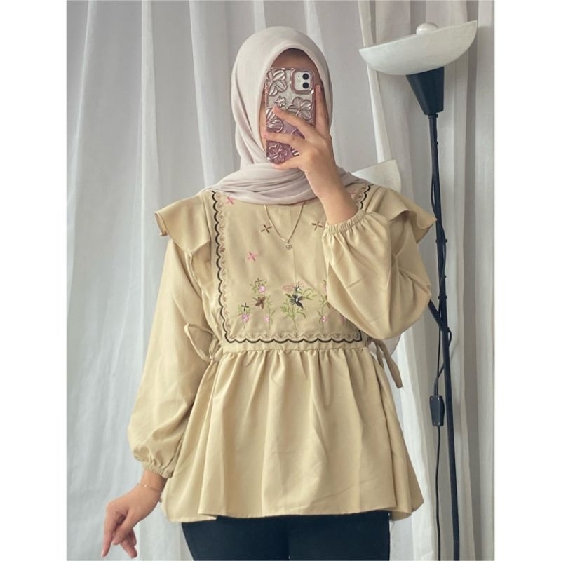RAHMS - Narika Shirt Atasan Wanita Muslim Katun Premium OOTD Korean Style | T0P BLOUSE KATUN BORDIR BUNGA BABYDOLL VARIASI TALI AKTIF