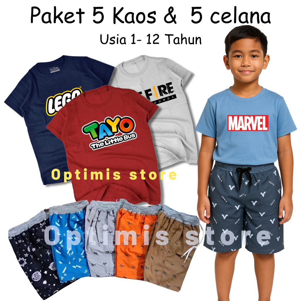 Setelan Kaos Anak laki laki Usia 1-12 Tahun unisex Paket 100ribu 5 Kaos Dan 5 Celana Pendek chinos motif