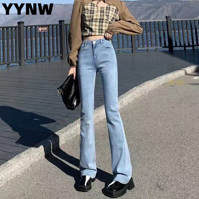 YYNW Highwaist Cutbray Jeans Celana Flare Panjang Stretch Wanita Retro Vintage Lipat Bawah