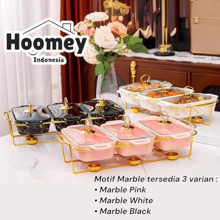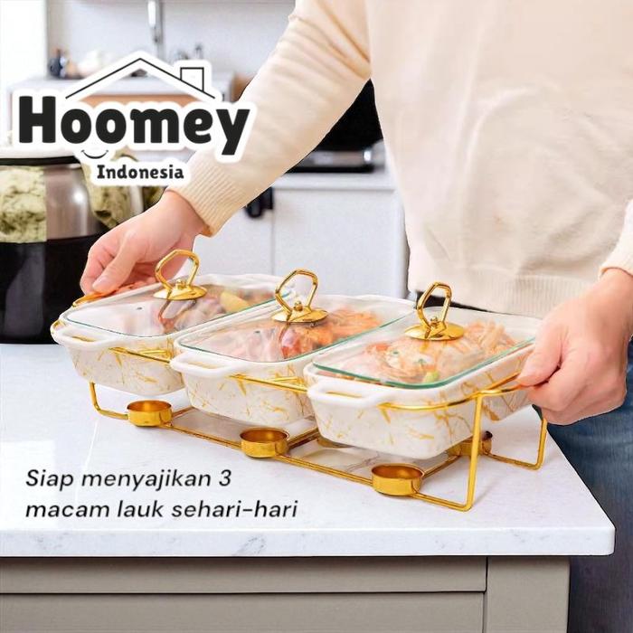 Hoomey Tempat Prasmanan Gandeng 3 Keramik (1L) | Gold Rak Besi Wadah Makan Emas Aesthetic - BLACK GOLD