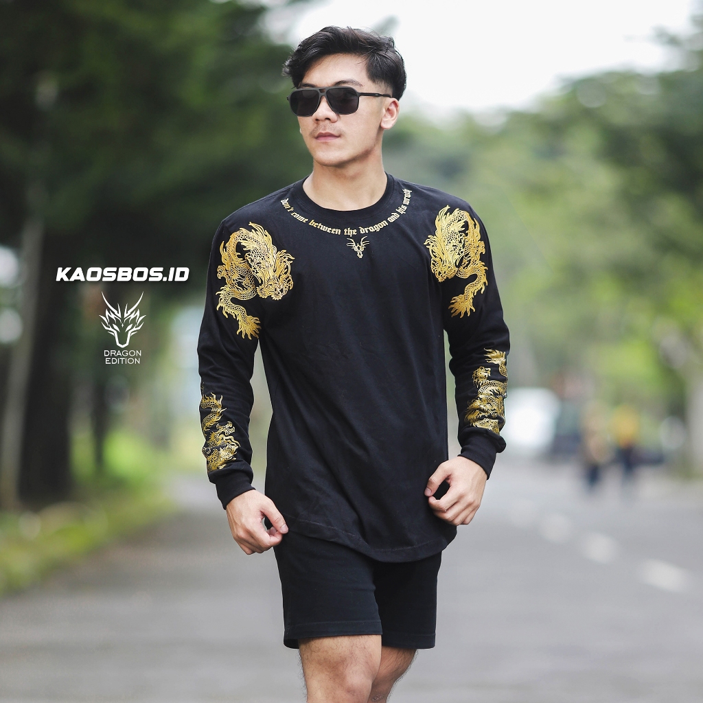 KAOSBOS.ID - Kaos Distro Dragon Naga Emas Timbul 3 Dimensi Tangan Panjang