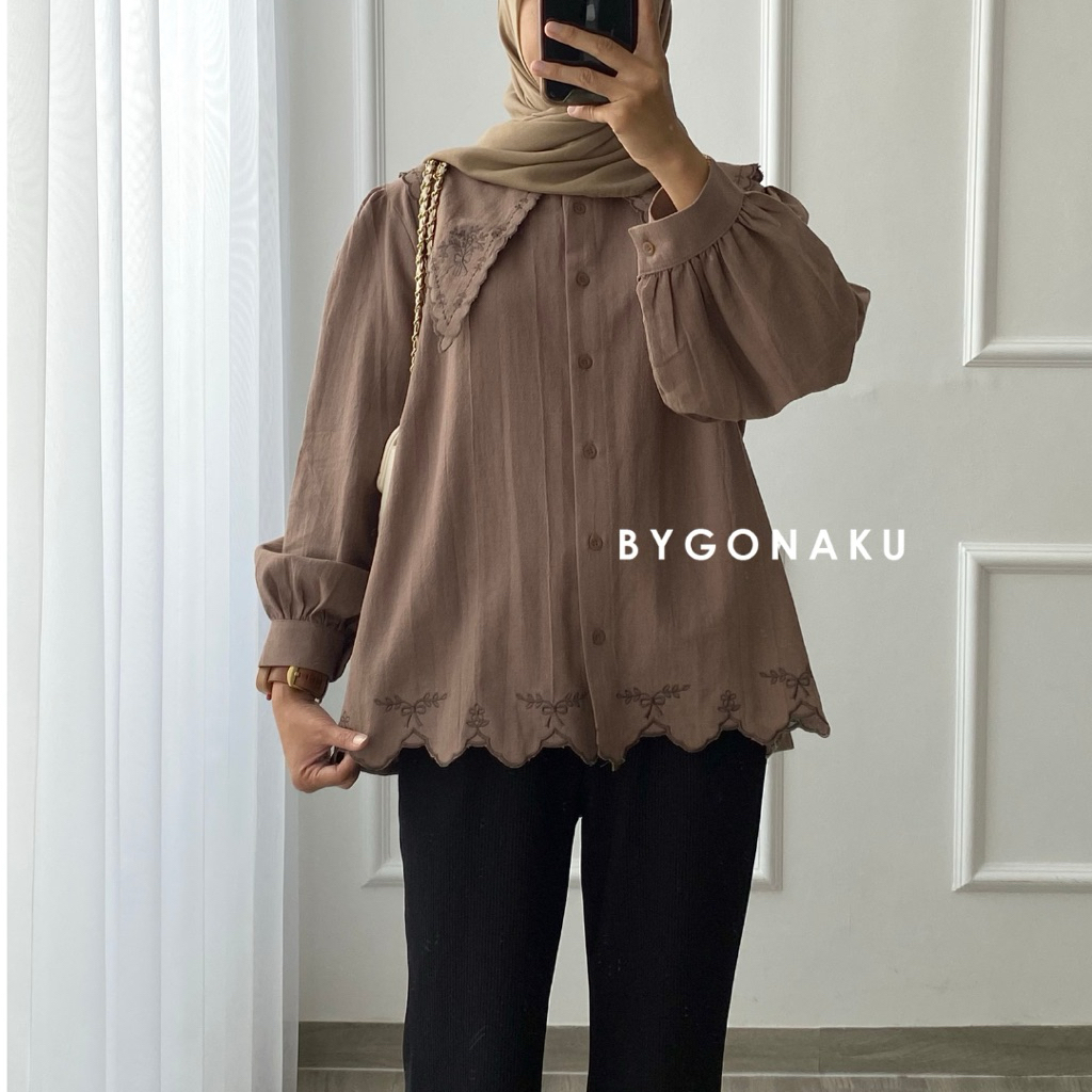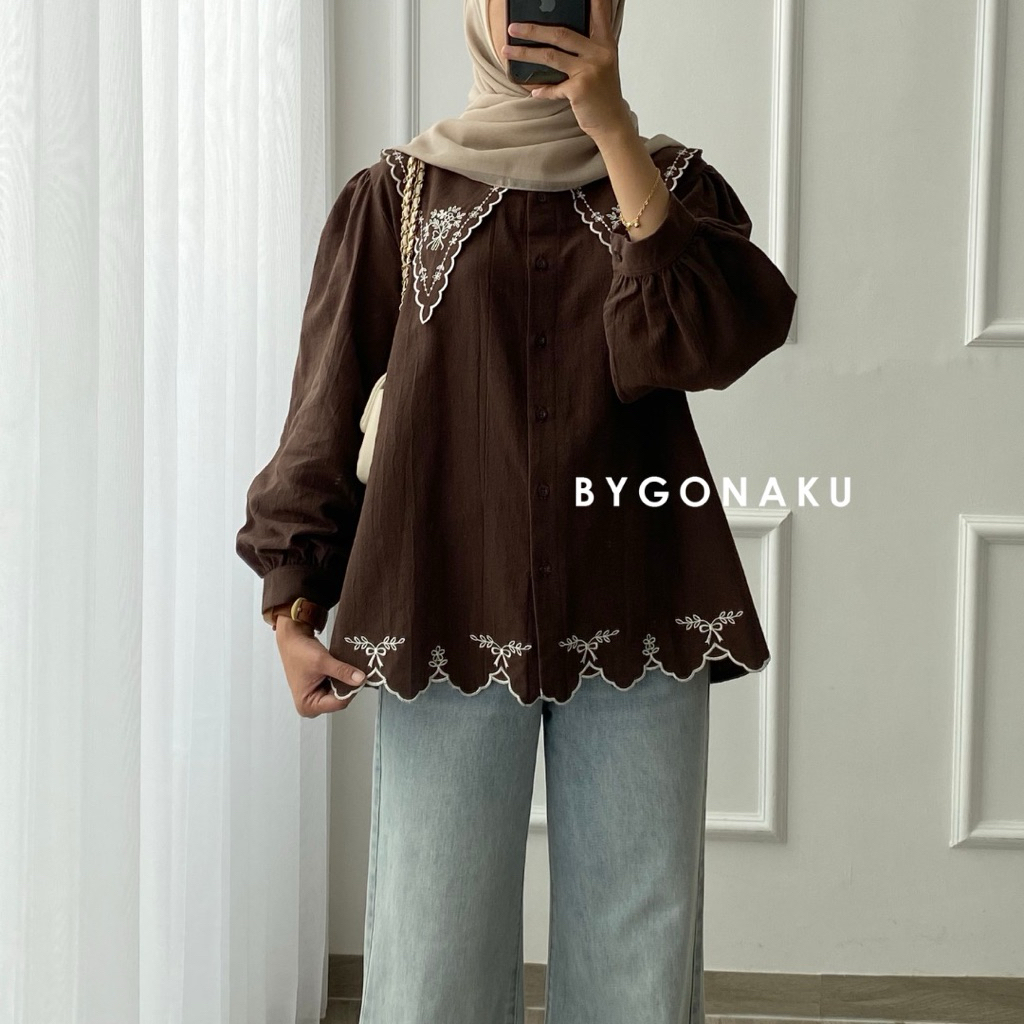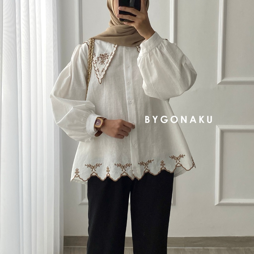 [GONAKU] Aura Top Shirt Embroidery Linen | Atasan Blouse Bordir Kemeja Kerja Kuliah Wanita Korean Style | Busui Friendly | Basic Shirt