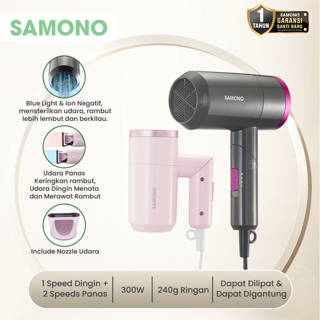 Hair Dryer Samono 3 Kecepatan Angin Dingin & Hangat Blue Light Ion 300W Foldable Sw-Hd03