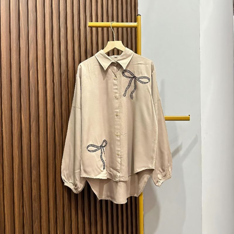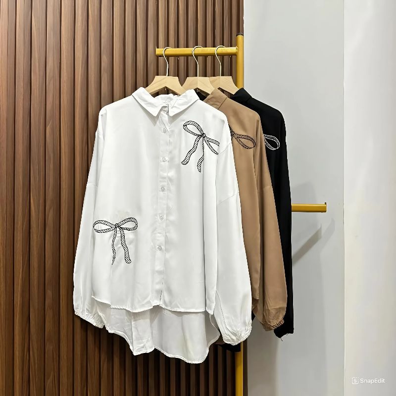 Glaudy Kemeja Rayon Twill Polos Atasan Pita Bordir