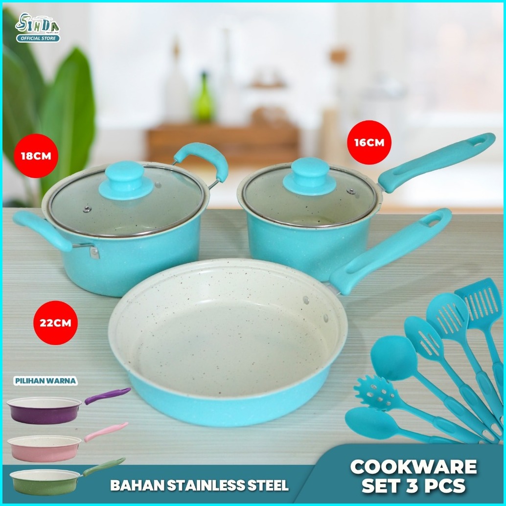 Sinda Panci Set 3pcs Lengkap Warna Frypan Saucepan Cookware Set Free Spatula