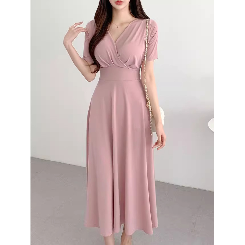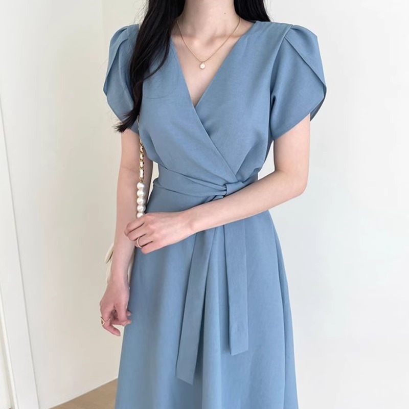 EMITA BLOOM summer dress biru muda wanita kekinian jumbo korean style bigsize baju midi dress polos press body terbaru l
