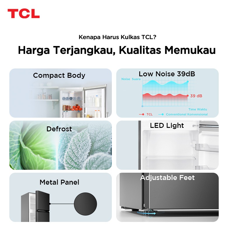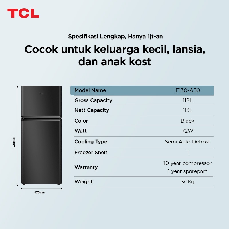 Kulkas 2 Pintu Tcl F130-A50 Kapasitas 118L Rak Freezer Terpisah 3D Surround Cooling