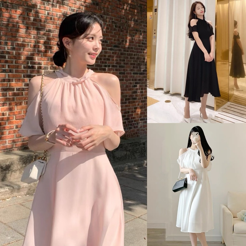 [ADA SIZE JUMBO] D1644 PROSPERO KOREAN STYLE VINTAGE MIDI DRESS SIMPLE POLOS PESTA KONDANGAN HALTER NECK