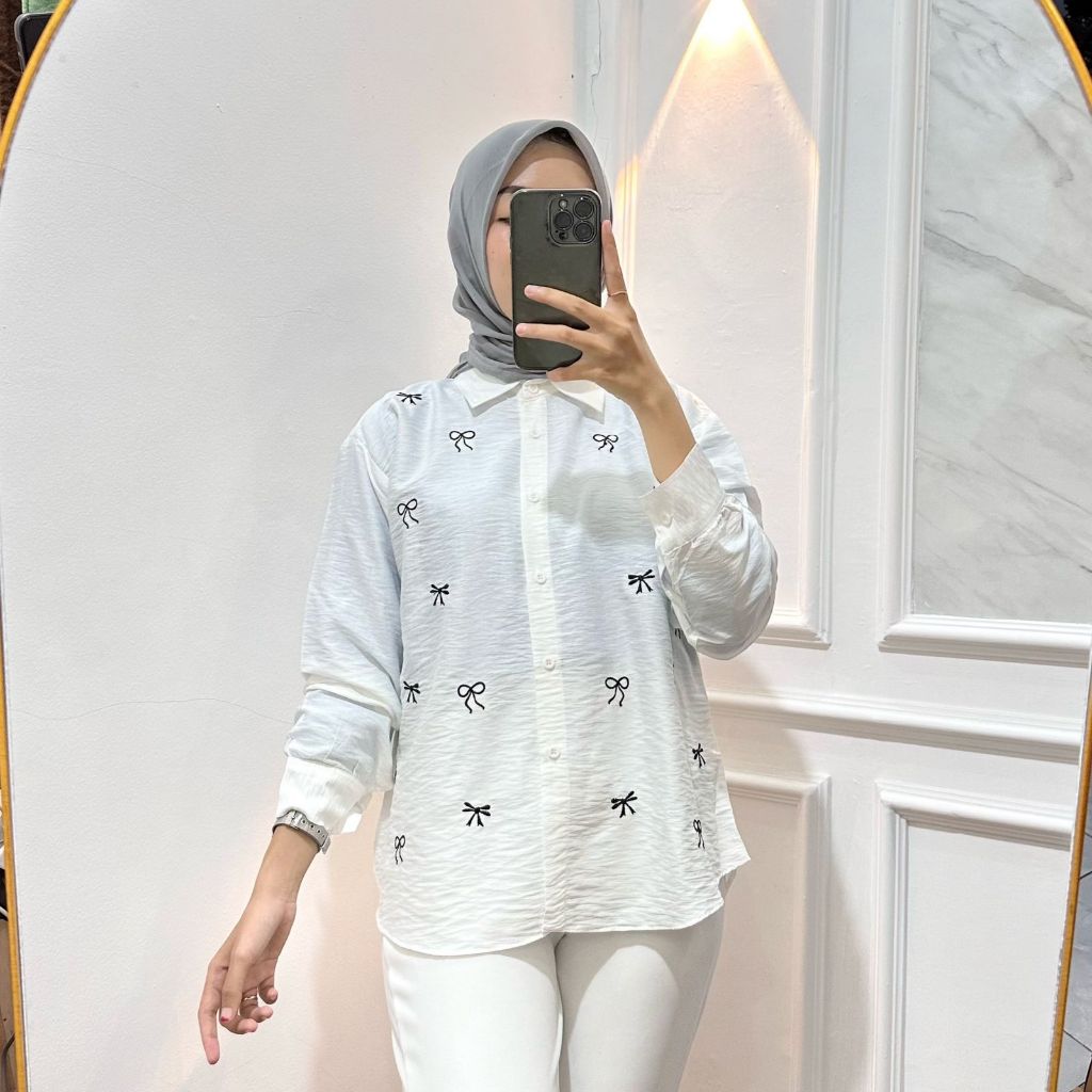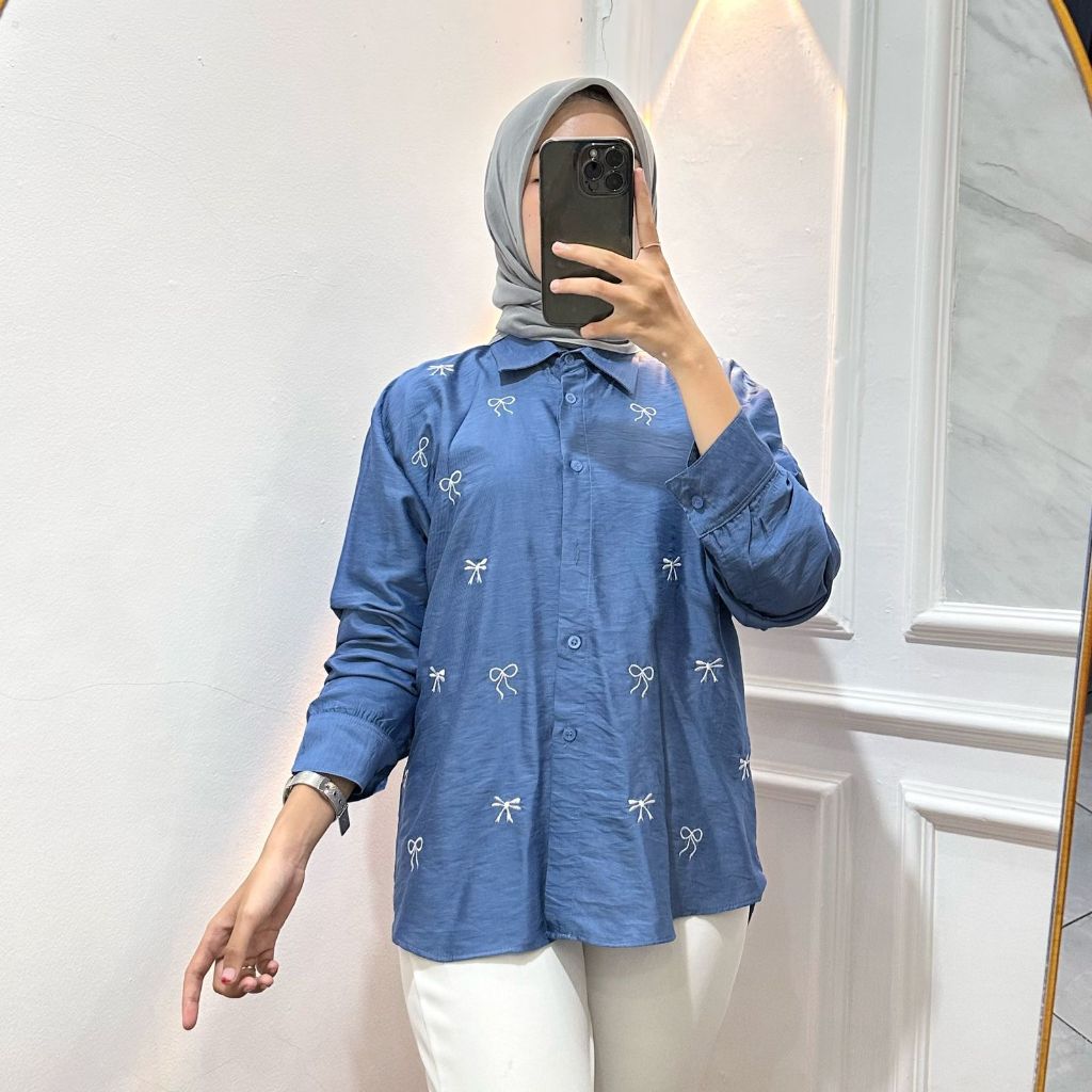Kemeja Motif Pita Bordir Polo Linen Atasan Blouse Wanita