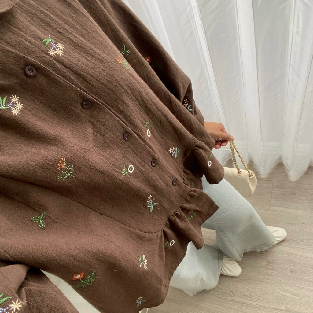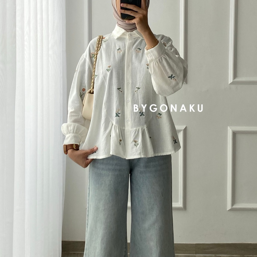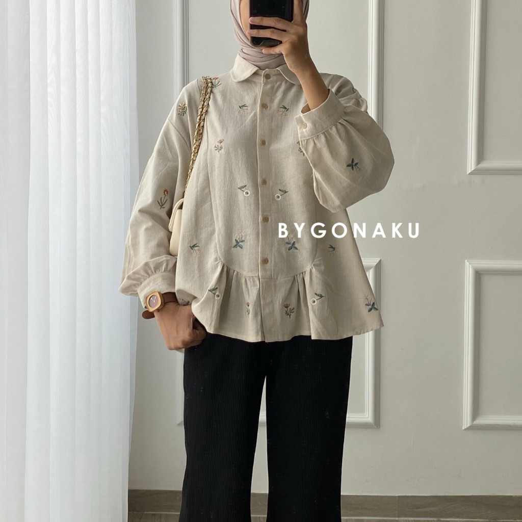 [GONAKU] Nadine Top Blouse Linen Bordir | Atasan Blouse Kemeja Kerja Wanita Korean Style | Busui Friendly