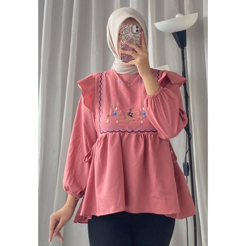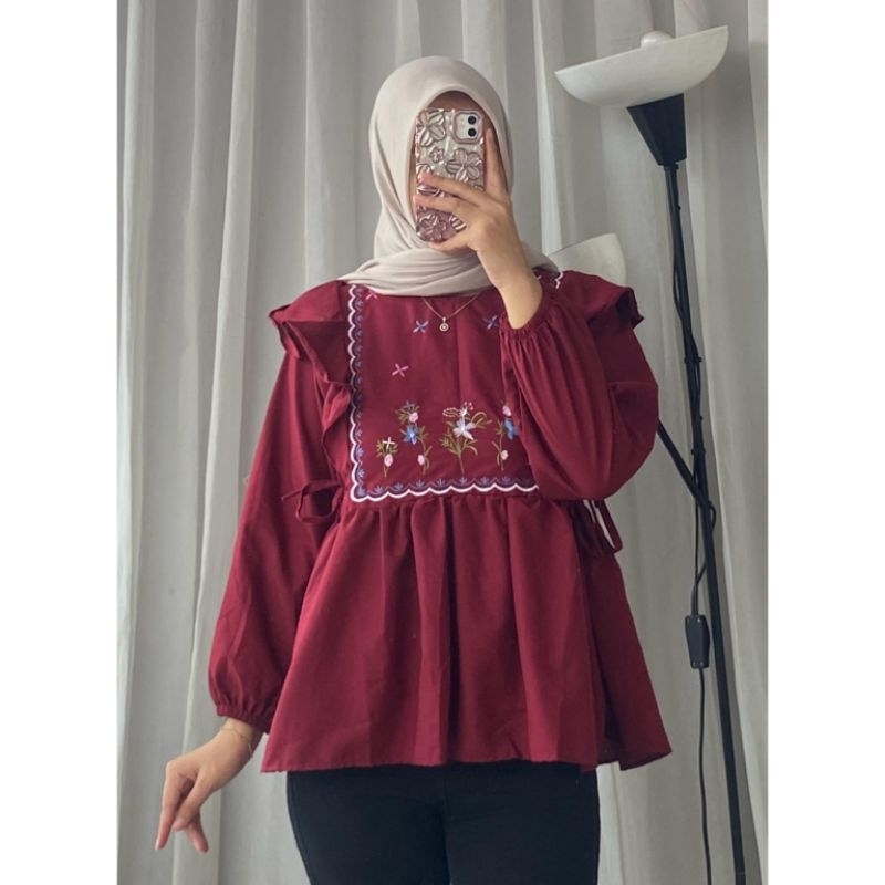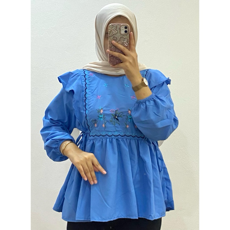 RAHMS - Narika Shirt Atasan Wanita Muslim Katun Premium OOTD Korean Style | T0P BLOUSE KATUN BORDIR BUNGA BABYDOLL VARIASI TALI AKTIF