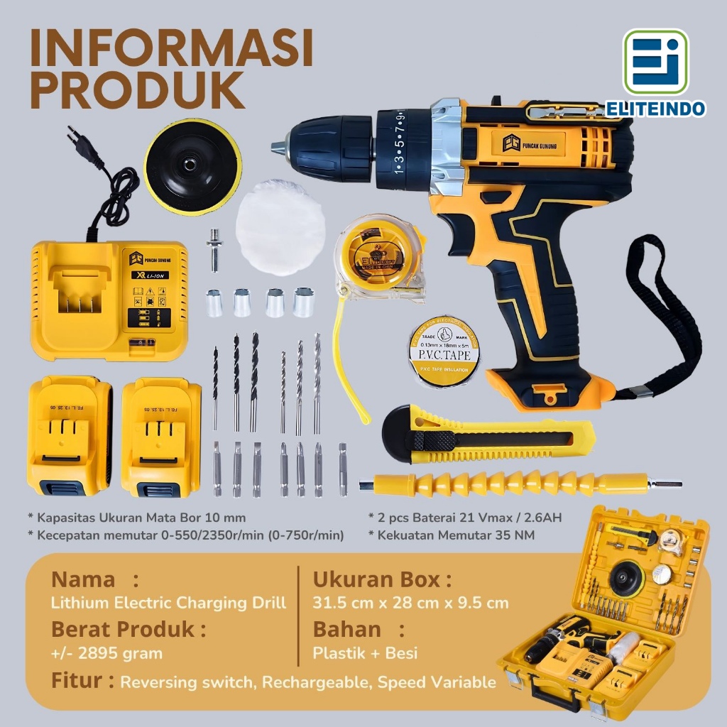 ELITE MESIN BOR IMPACT 2 BATERAI FULLSET TANPA KABEL CAS LISTRIK CORDLESS DRILL TANGAN LENGKAP G11F1 ORIGINAL
