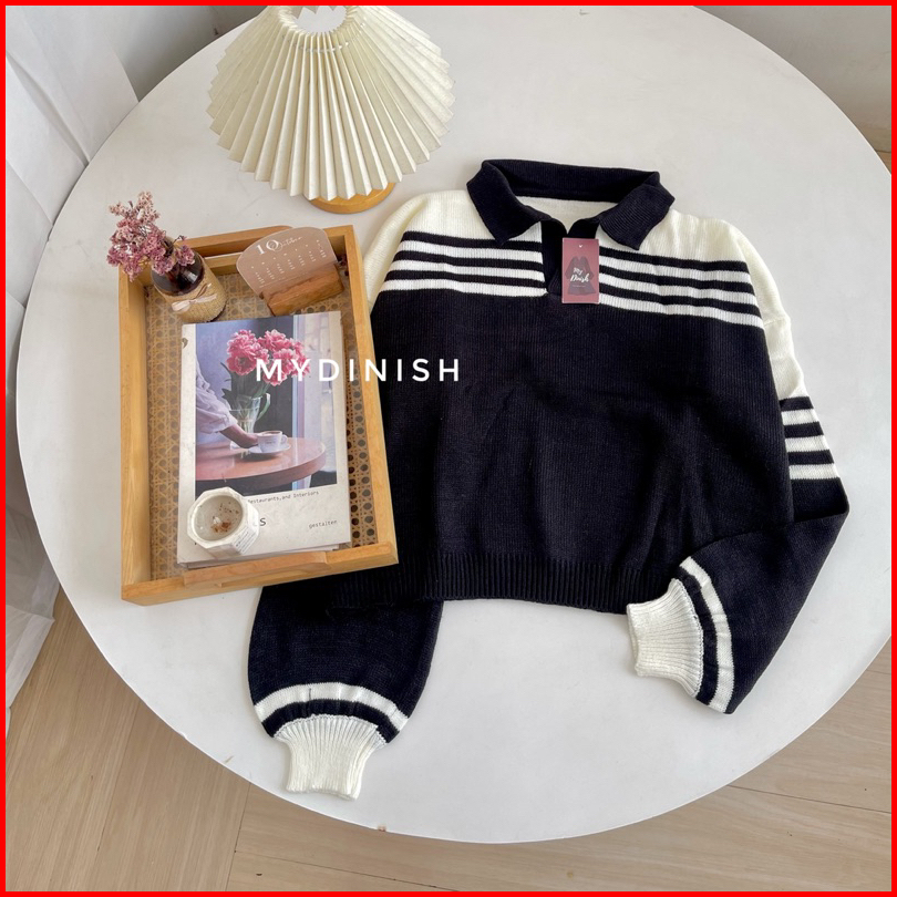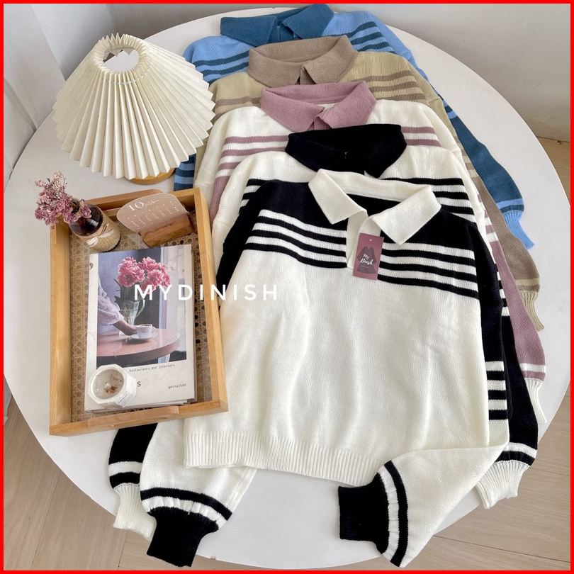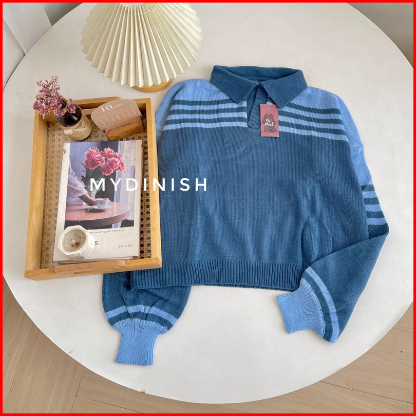 Asmiranda Polo Sweater Rajut Wanita Berkerah Motif Stripi