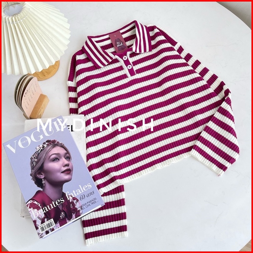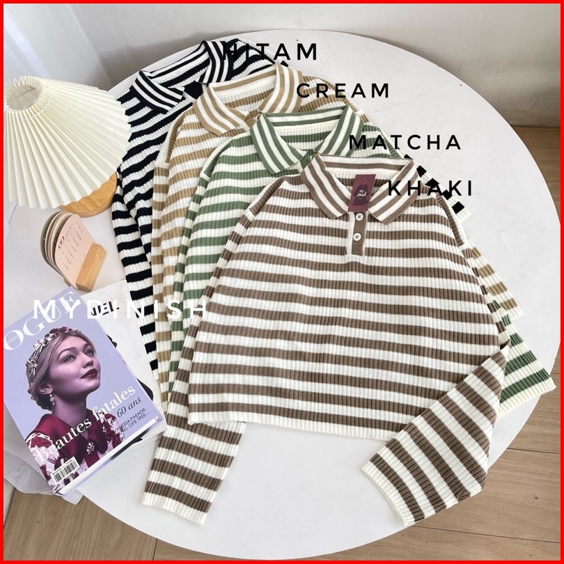Freya Crop Blouse - Atasan Blouse Wanita Berkerah Polo Motif Stripe
