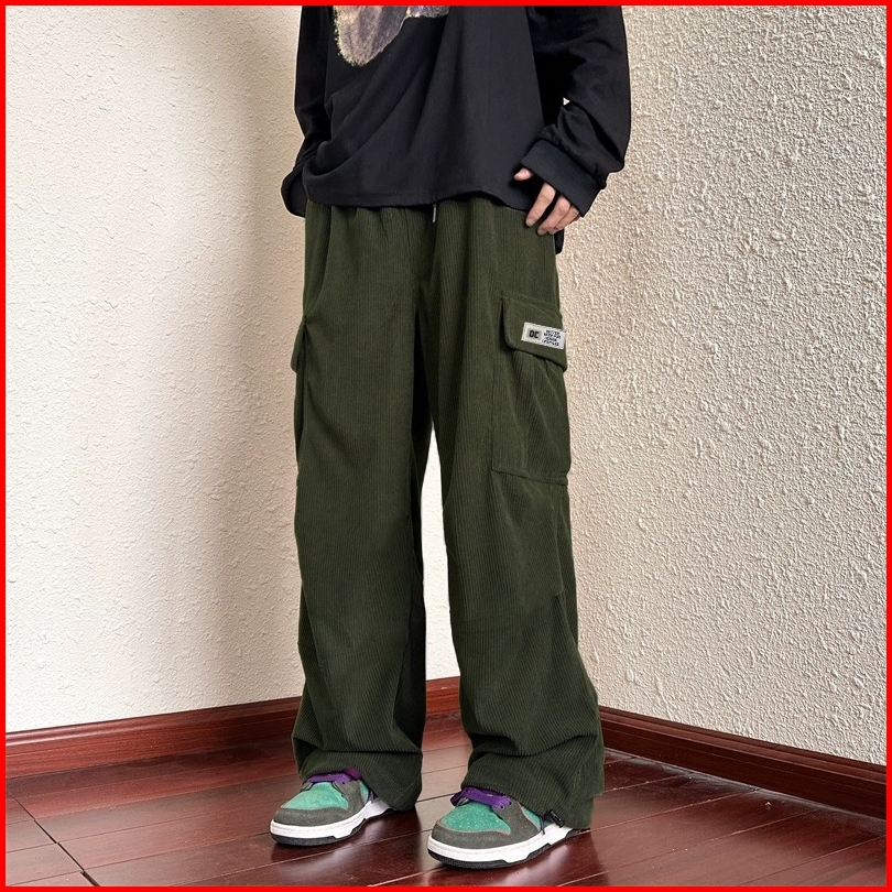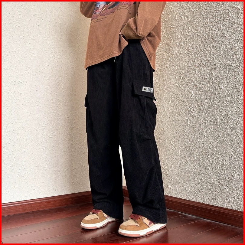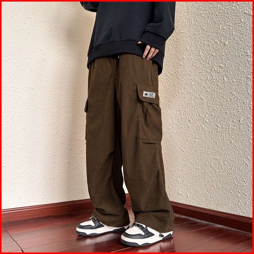 Celana Corduroy Pria Straight Casual Celana Panjang Cowok Retro Distro Saku Samping Celana Cargo Tali Terbaru Korean Sty