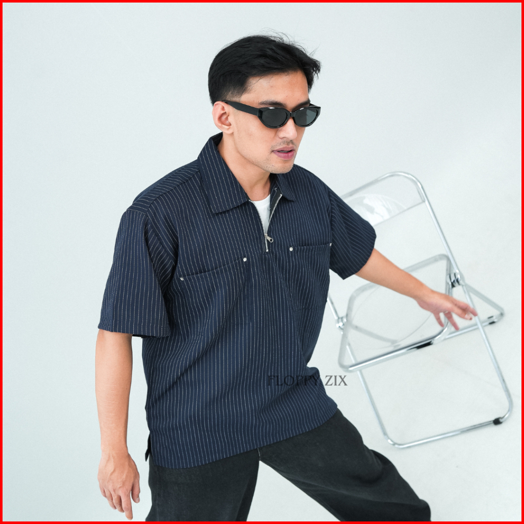 Kameja Stripe Zipper Oversize Kameja Salur Kameja Tangan Pendek Kameja Garis Garis