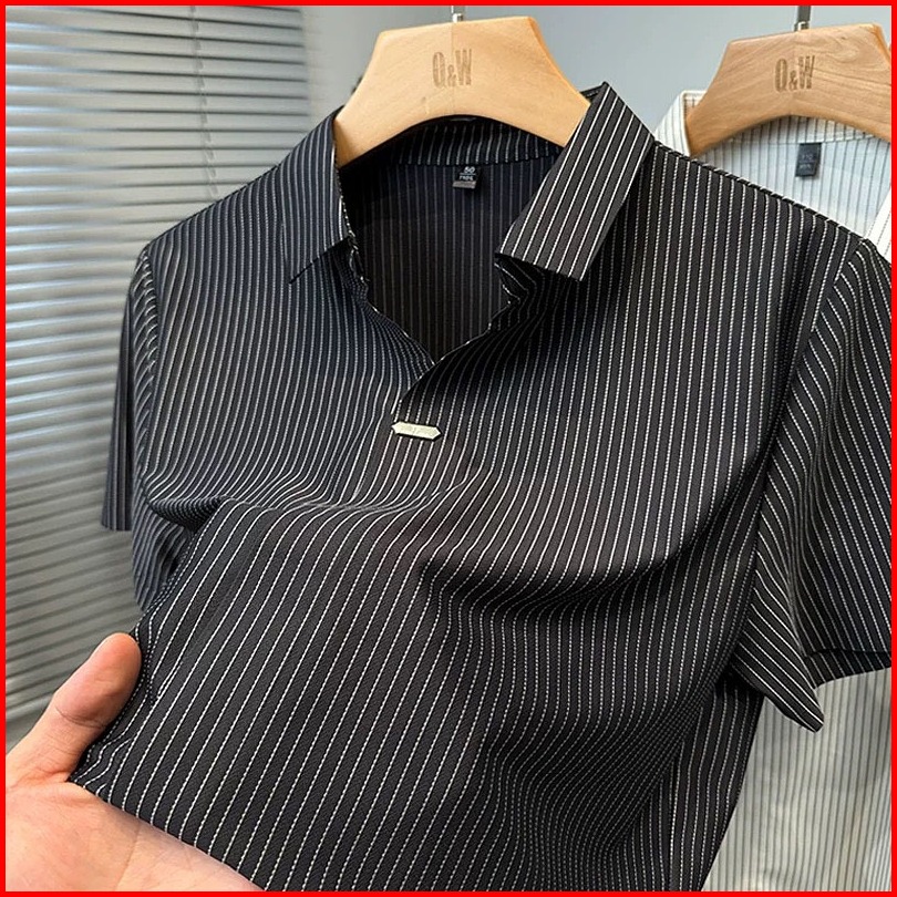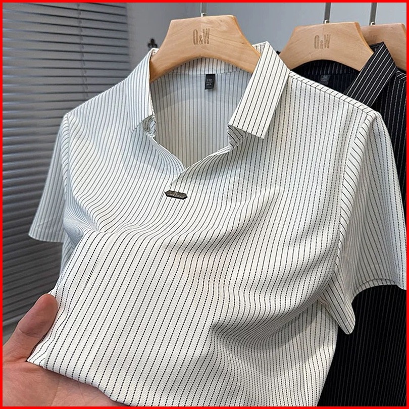 Polo Shirt Pria White Lengan Pendek Cool Kemeja Kerah Stand Pola Garis Korean Style Dewasa Cowok T-shirt