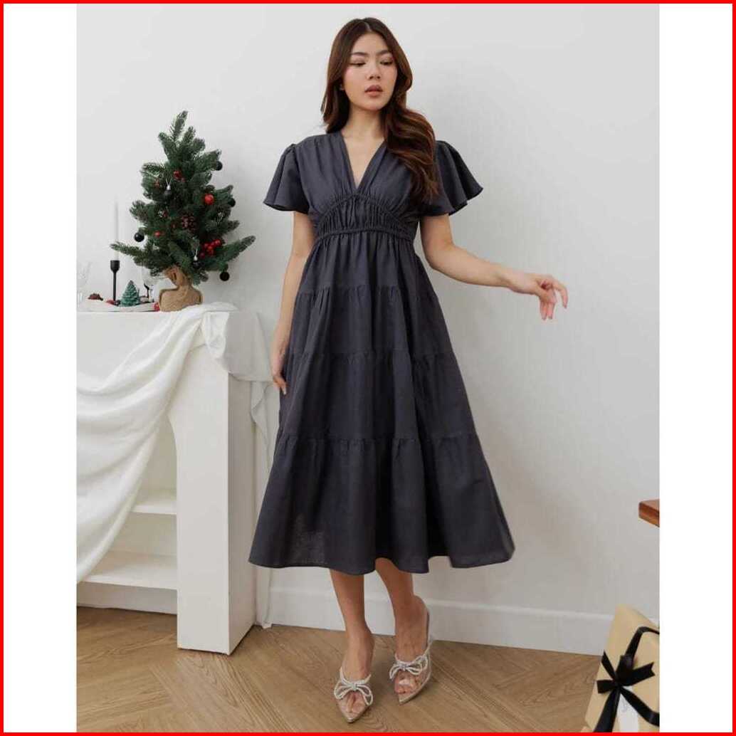 Megan Midi Dress Wanita Rok Susun Leher V Tangan Pendek Korean Style Bahan Rayon Twill