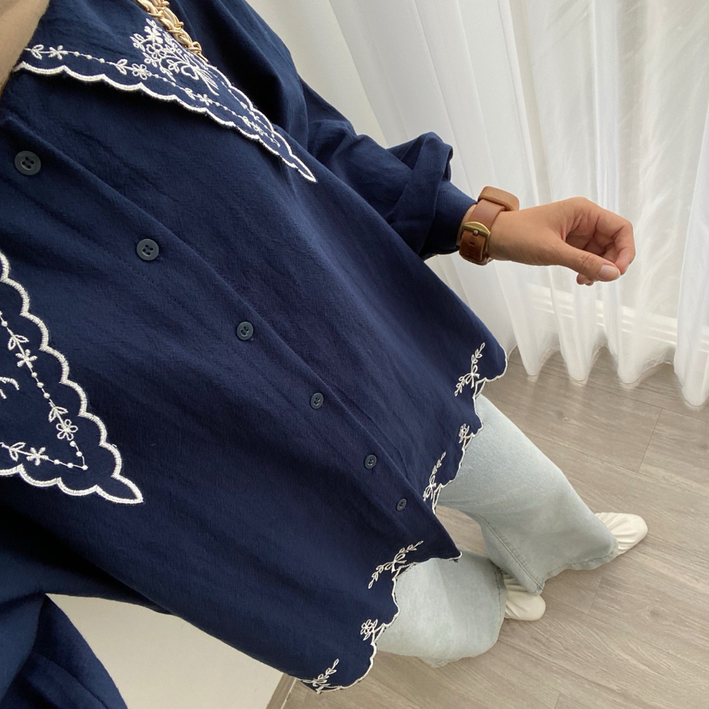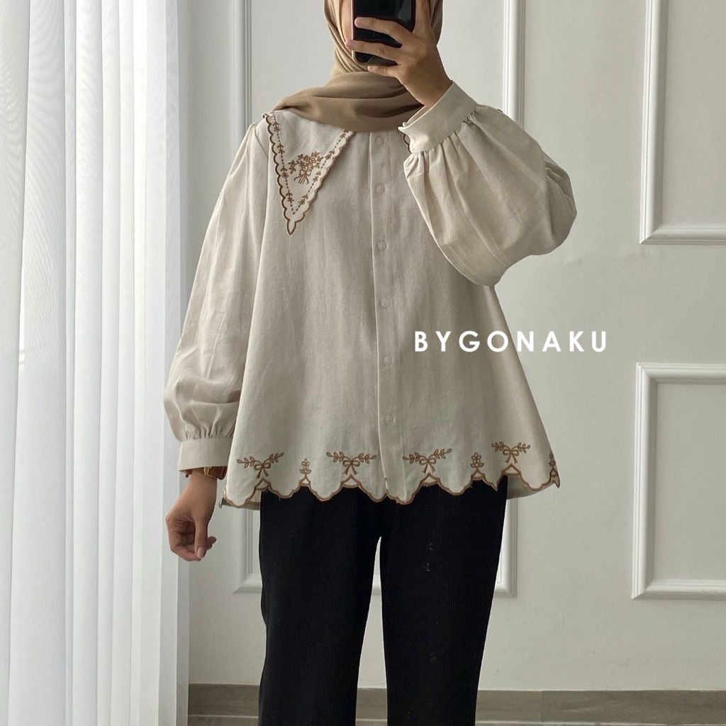 [GONAKU] Aura Top Shirt Embroidery Linen | Atasan Blouse Bordir Kemeja Kerja Kuliah Wanita Korean Style | Busui Friendly | Basic Shirt